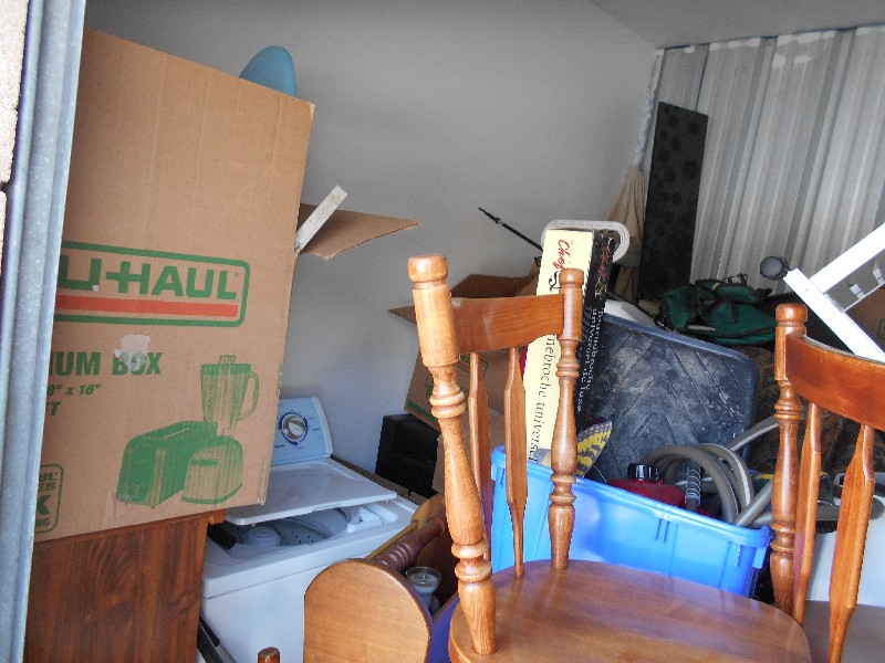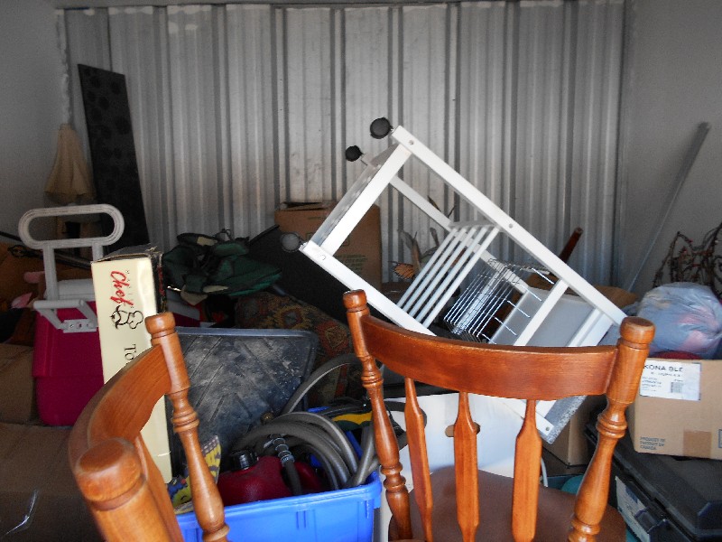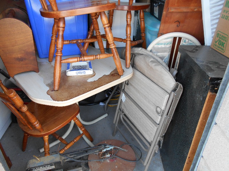table, ash tray, chairs, folding chair, washing machine, dressers, cooler, umbrella, kitchen hutch, dose, saw, office chair, tool box, tote, tv, boxes, chair, Christmas decorations, snow blower