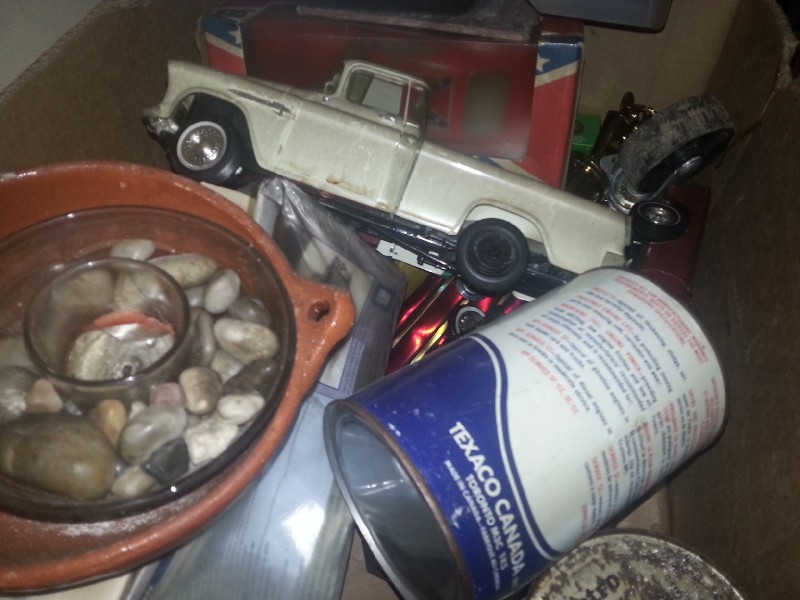 household goods, work light, model cars, tool box.