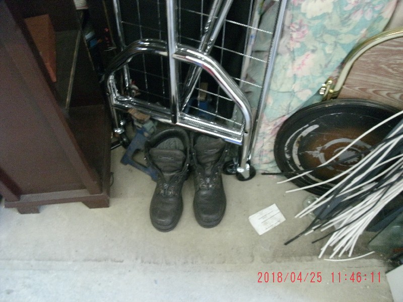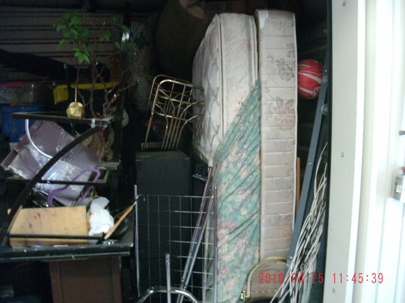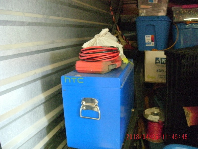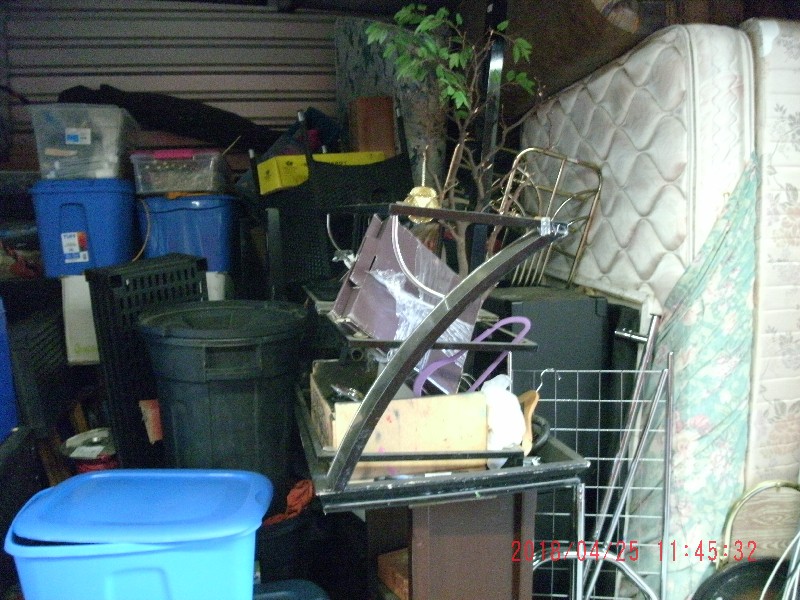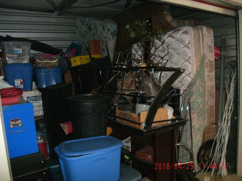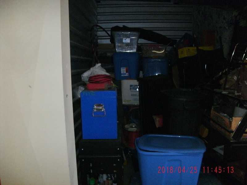 The Unit appears to contain: tool boxes, work boots, roller cart, totes, mattress and box spring, artificial plants, chair, shelves, speaker unit, Christmas decorations, tires, electrical wire, extension cords