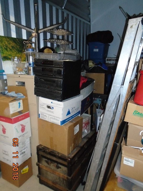 The Unit appears to contain: stuffies, stereo, filing cabinet, step ladder, drill press, chest, snowshoes, coffee table, totes, climbing helmets, suitcases, skis, ski poles, ice picks, dog crates, shoes, life vest, camping lantern, paintings, duffle bags, pet carrier, boxes