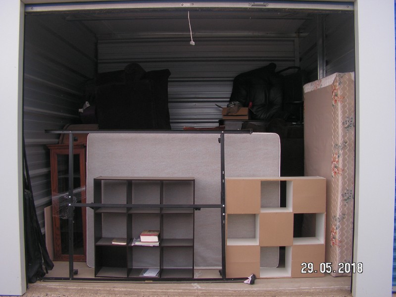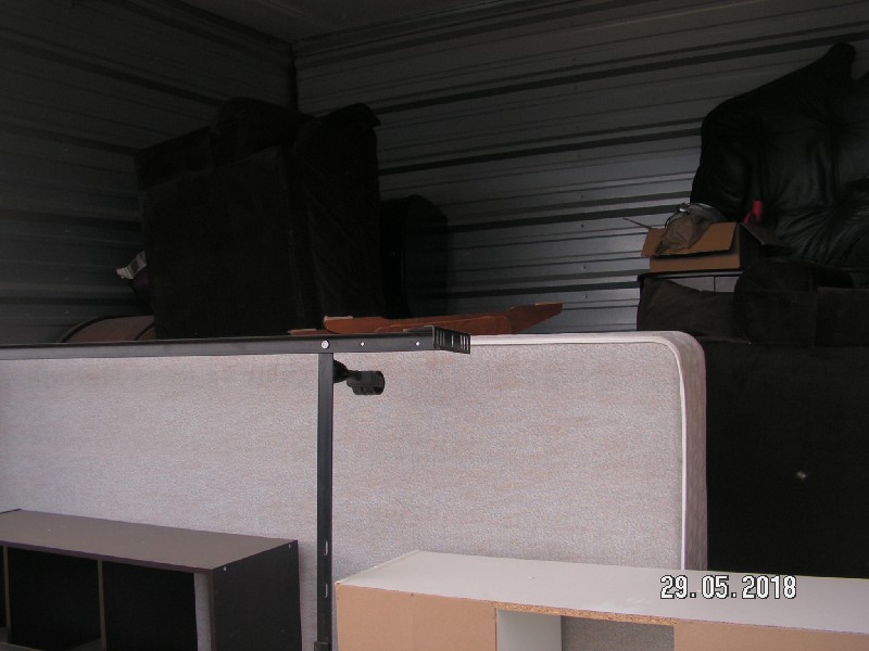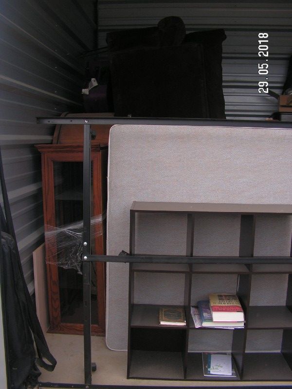 The Unit appears to contain: mattress, bed frame, suitcase, chairs, couch, shelves