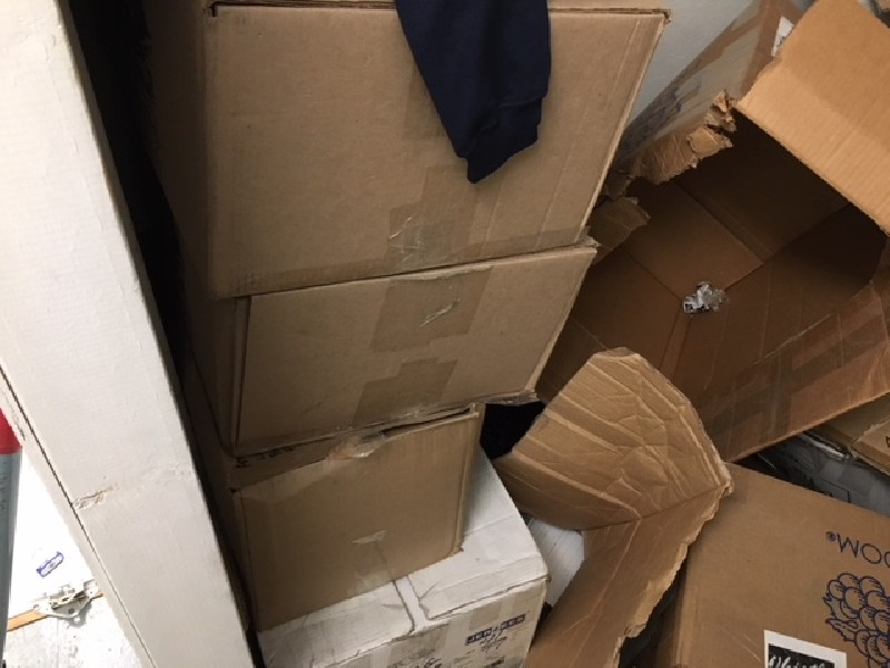 A large number of boxes, some empty, some open, most are sealed, clothes,