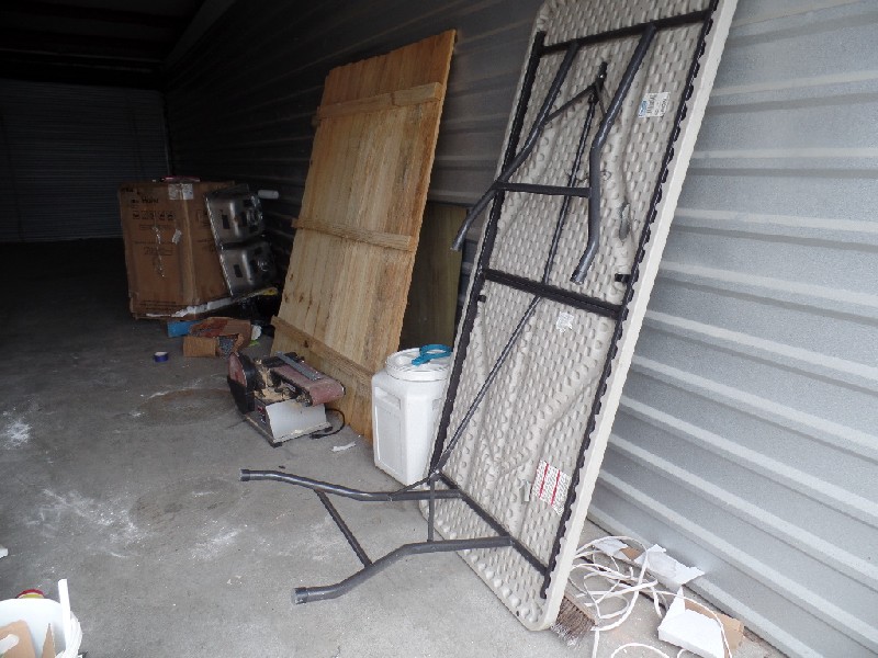 Unit appears to contain: belt sander, folding table, mirrors, stainless steel sink, new washing machine, painting equipment