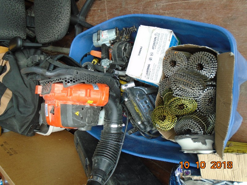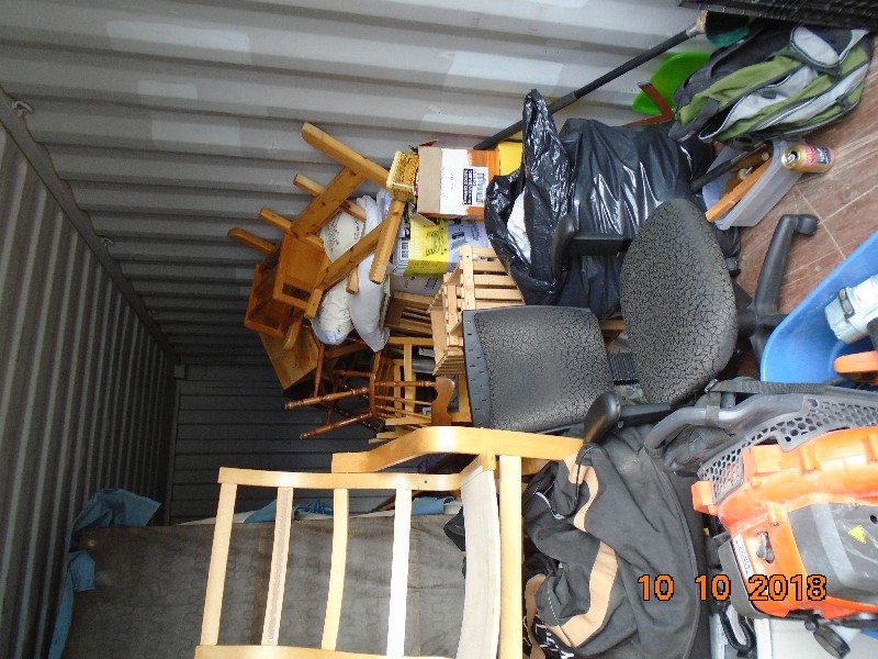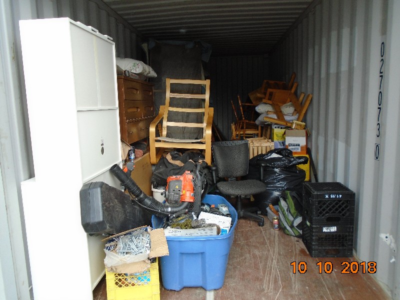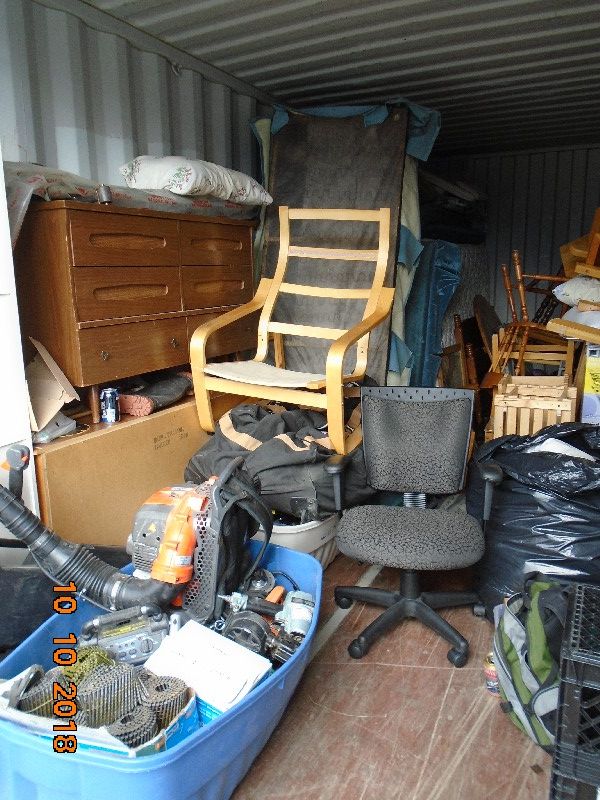 The Unit Appears to Contain: bureaus, hutch, chairs, table, tools, a box of nails, queen bed, couches, pillows, blankets, totes, skis, sports gear, boxes, gas-powered blower, backpacks, drill bits, lamps.