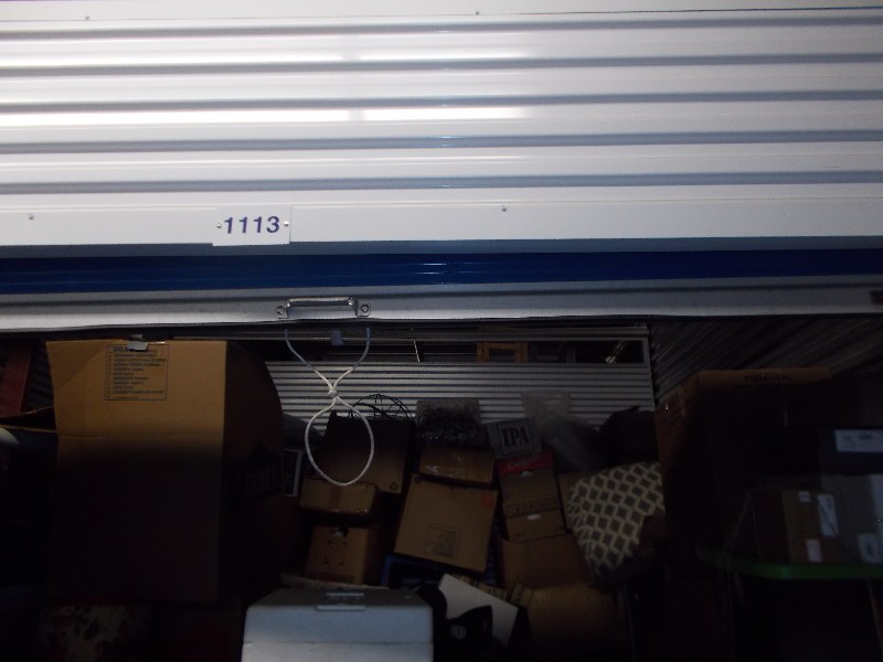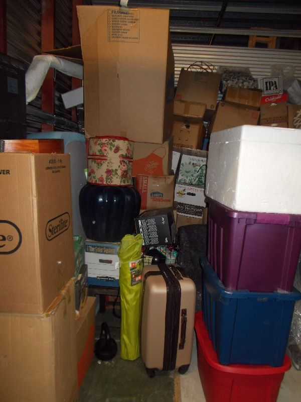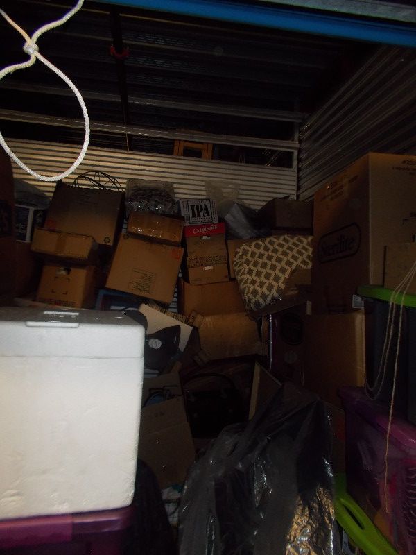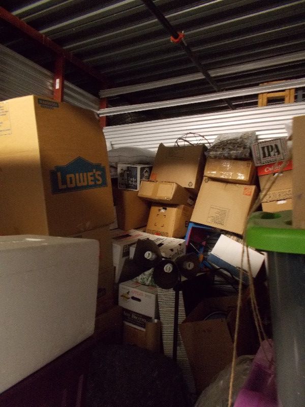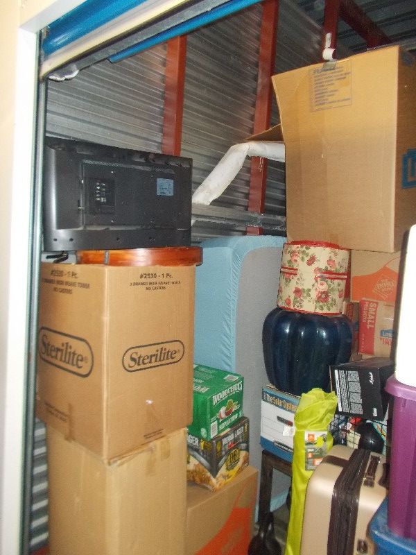 This is a 10x10x8 ground level unit. This unit contains: Boxes, Totes, Mirror, Television, Mattress, Furniture, Floor Lamp and other miscellaneous items.
