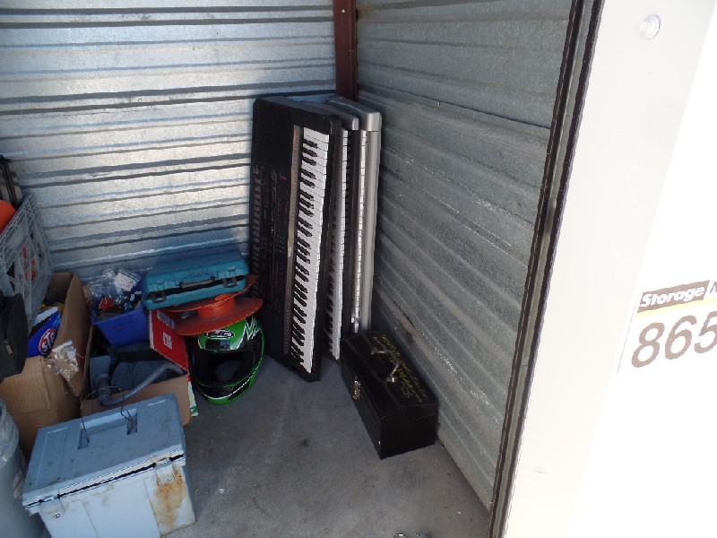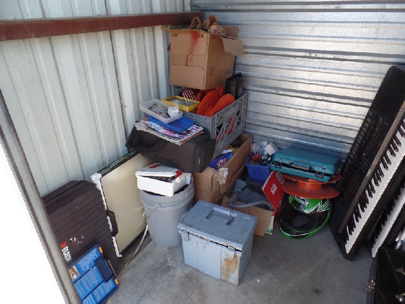 Unit appears to contain: keyboards, motorcycle helmet, tool box, camera bag, baseball gloves