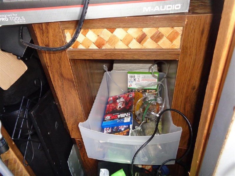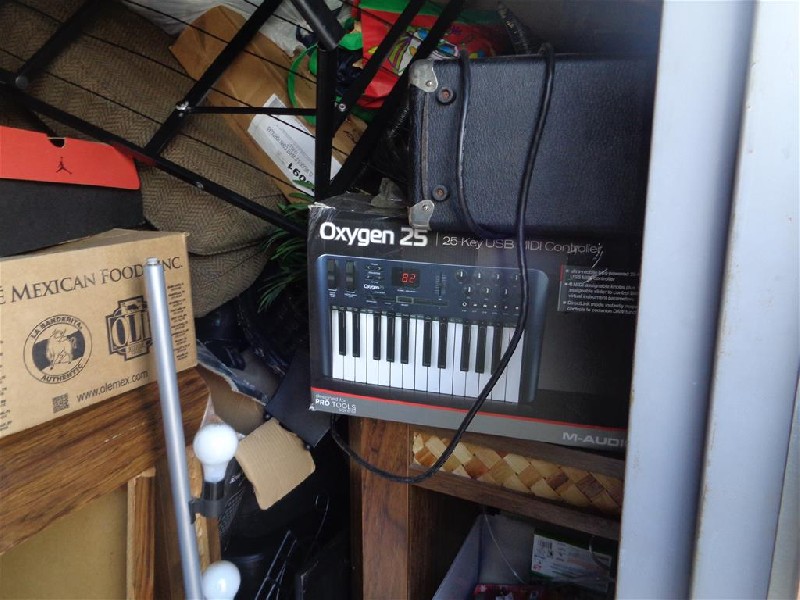 This unit appears to contain electronics (computer components, PS4/Xbox games, amplifier), drum set, guitar, furniture, washer and dryer set, board games.