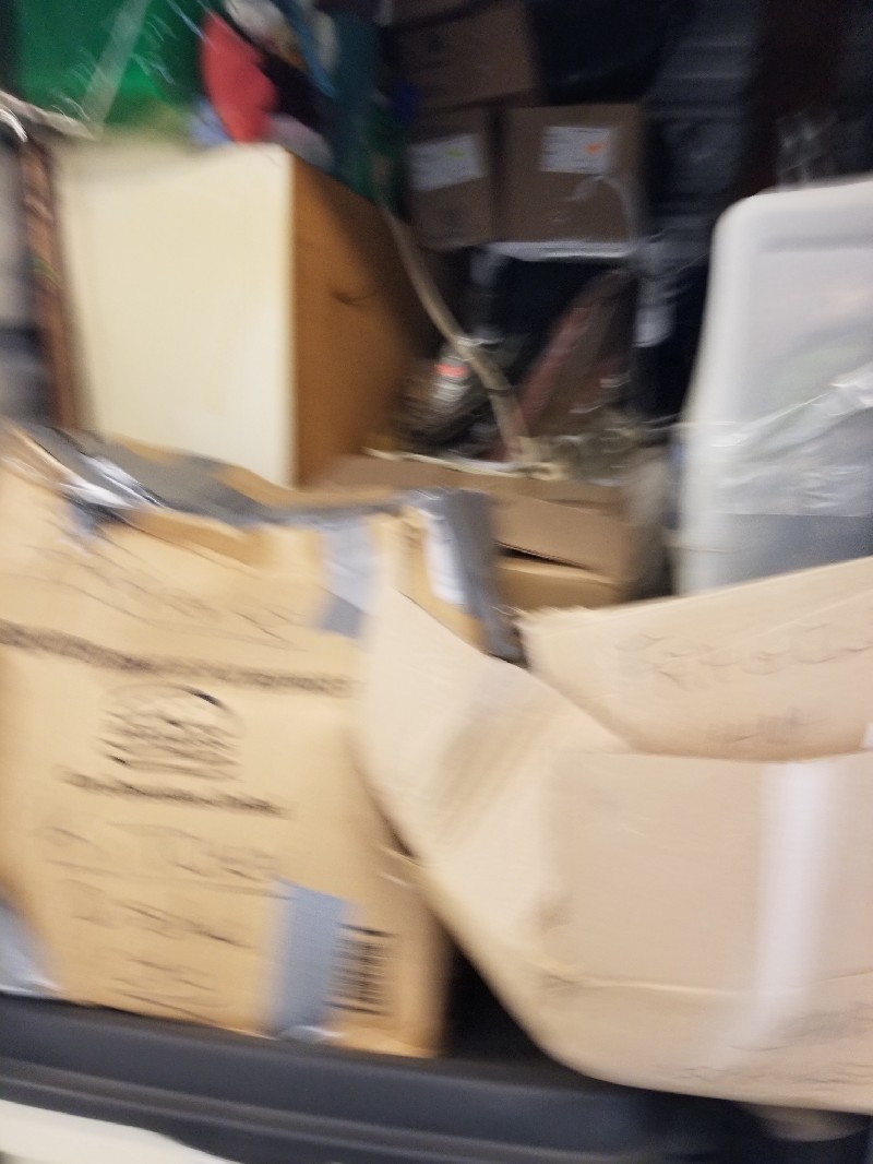 boxes, bins, shelves, old tap recorder, microwave oven, etc.