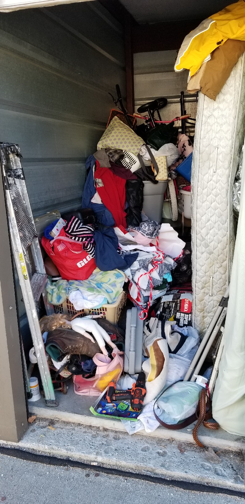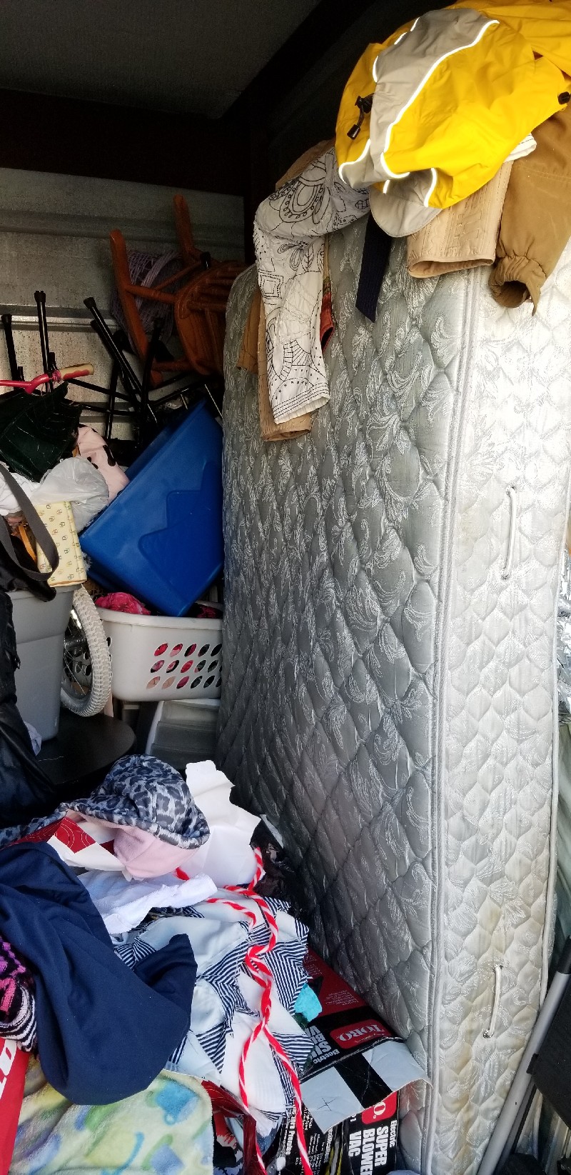 mattresses, ladder, clothes, car jack, drill, table, clothes, bags, bike, chair