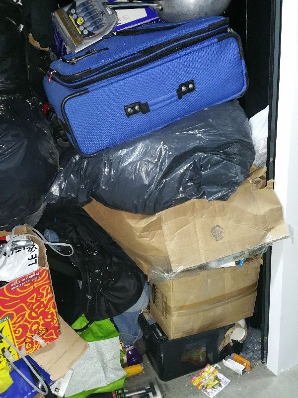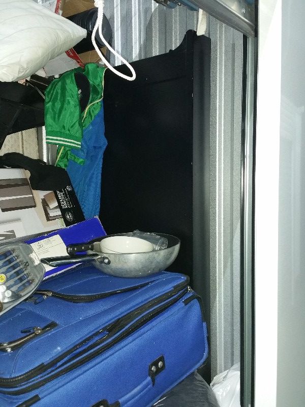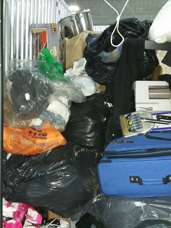 unit is full, house hold items, bed headboard, lots of clothing. this unit is full, top to bottom, front to back. may have a lot of hidden treasures.