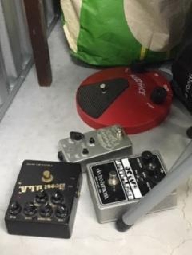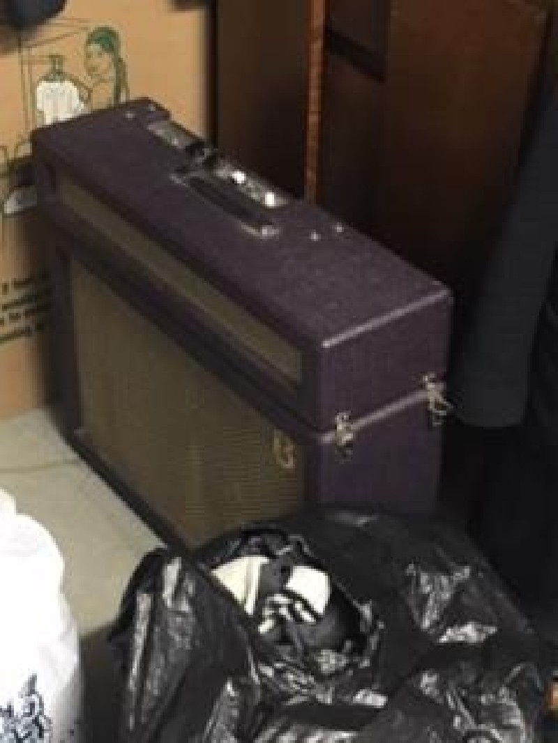 This unit has an aquarium, dresser, tool box, corner shelf unit, amp, speakers, clothing, and guitar case possibly with guitar inside.