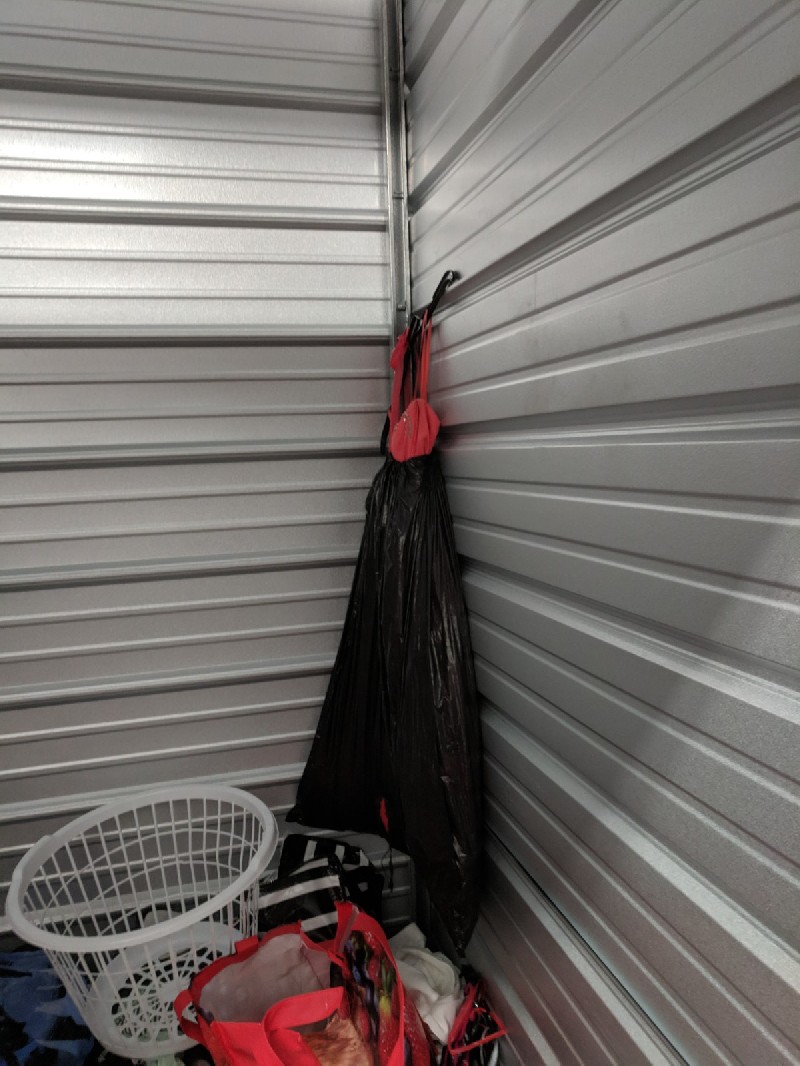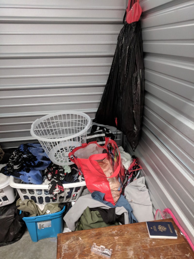 Unit Appears to Contain: Small Table, Baskets of Clothes, Totes