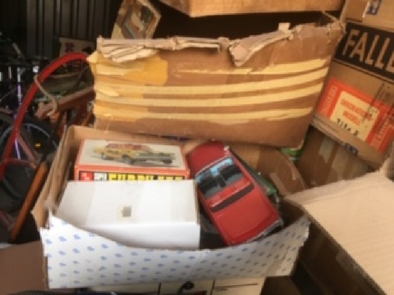 16 vintage bicycles, lawn chair, doll house, toy train set, Granco FM receiver, sled, toys, books, tool box, child size toy tractor, aluminum step ladder, boxes