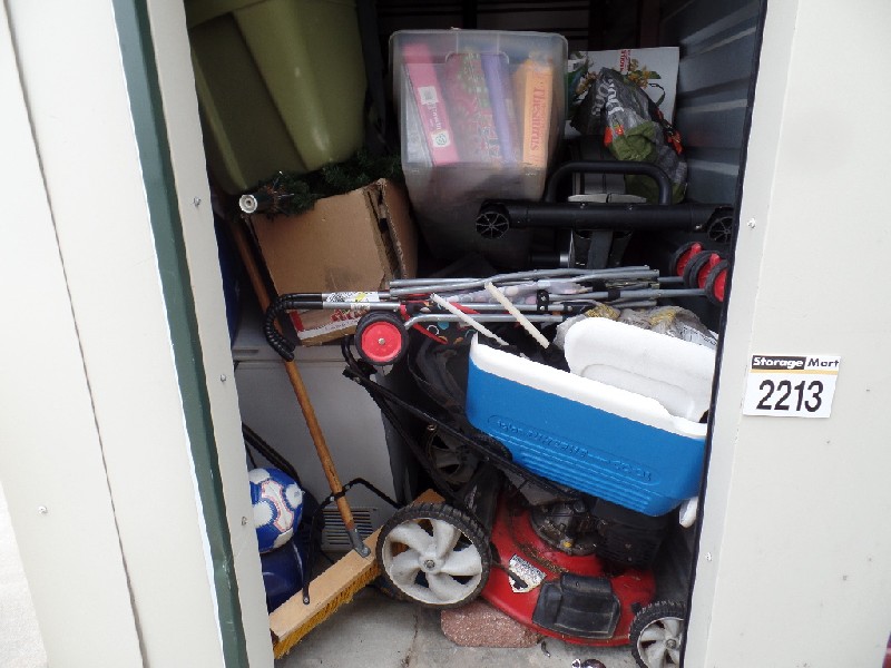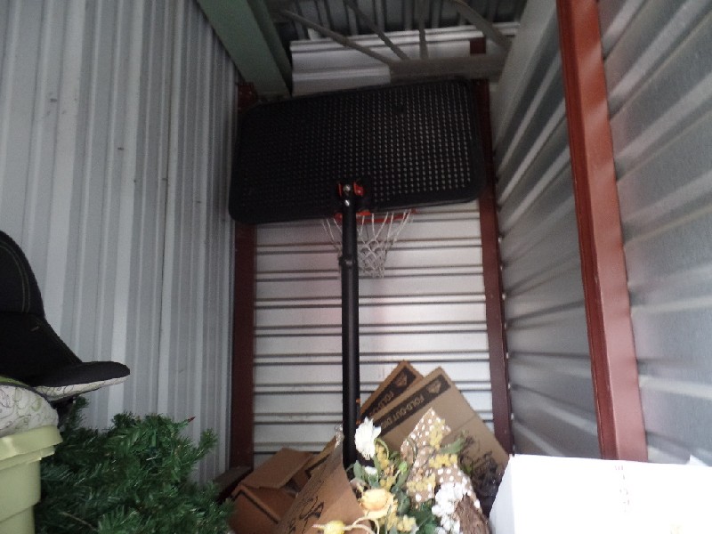 Unit appears to contain: lawnmower, freezer, elliptical, basketball goal, tools, totes, cooler