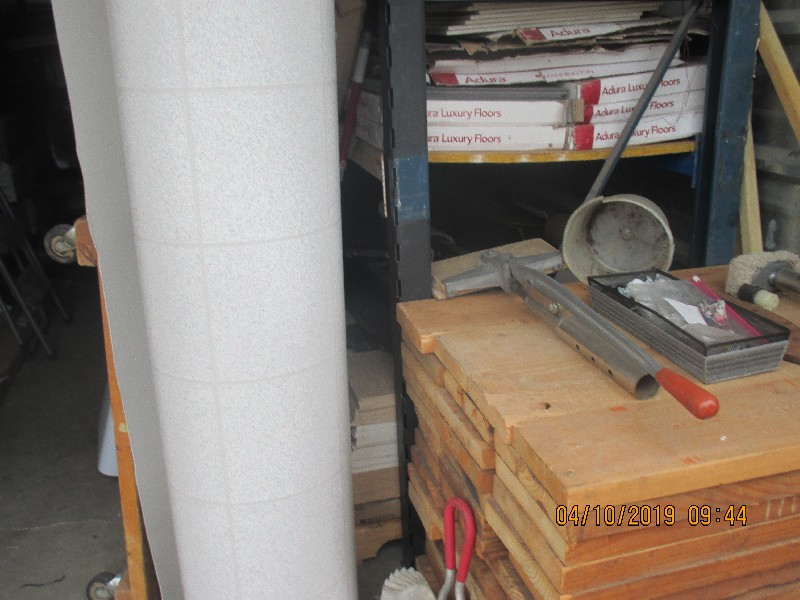 shelving, floor tiles, misc wood pieces, gas grill, chairs, dolly, metal stripping