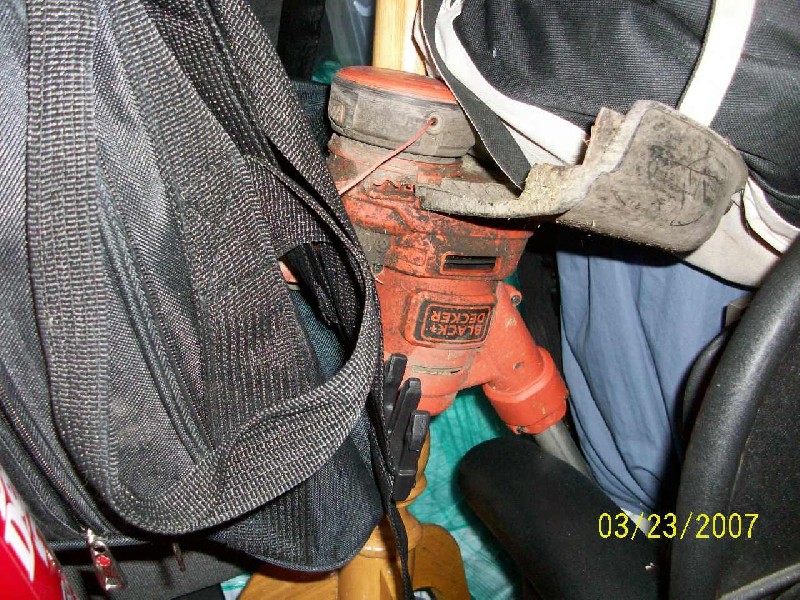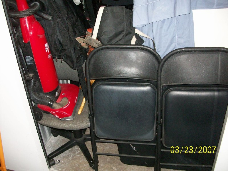 Folding chairs, office chair, tool box, step ladder, framed paintings, vacuum, totes, black & decker trimmer, extension cords, boxes, metal cabinets and furniture.