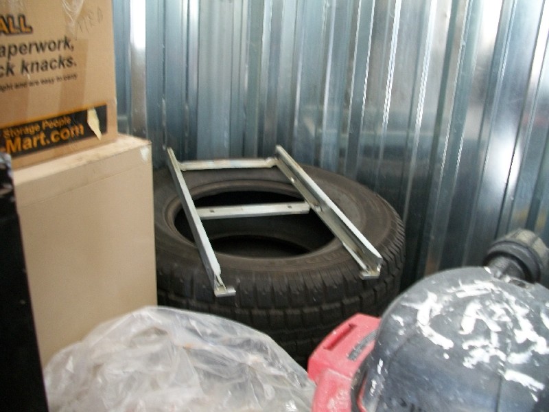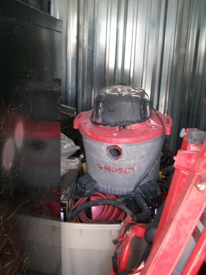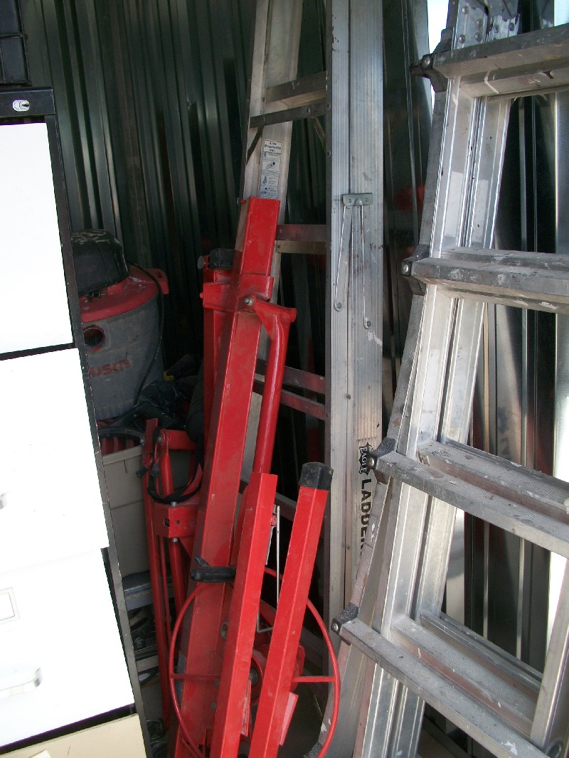 Ladders, shop vac, 3 filing cabinets, Dewalt drill, record albums, tar paper, plastic roll, tires, tools, table saw, and boxes.