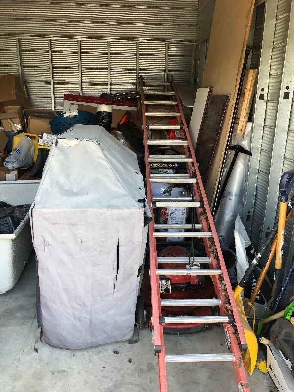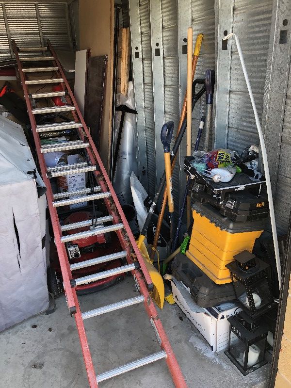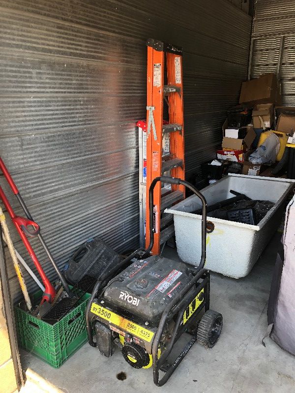 3 Ladders, generator, BBQ, Lawnmower, misc tools, misc gardening equipment, bathtub, tire, gas cans, wood, misc bins, misc boxes, safety cones, extension cords, lanterns, painters equipment,shop vac hoses, tool kits, leaf blower.