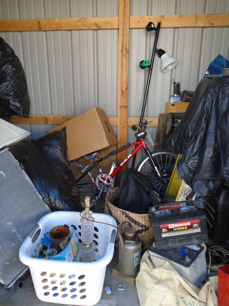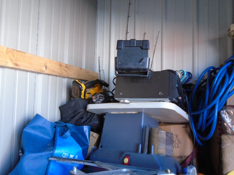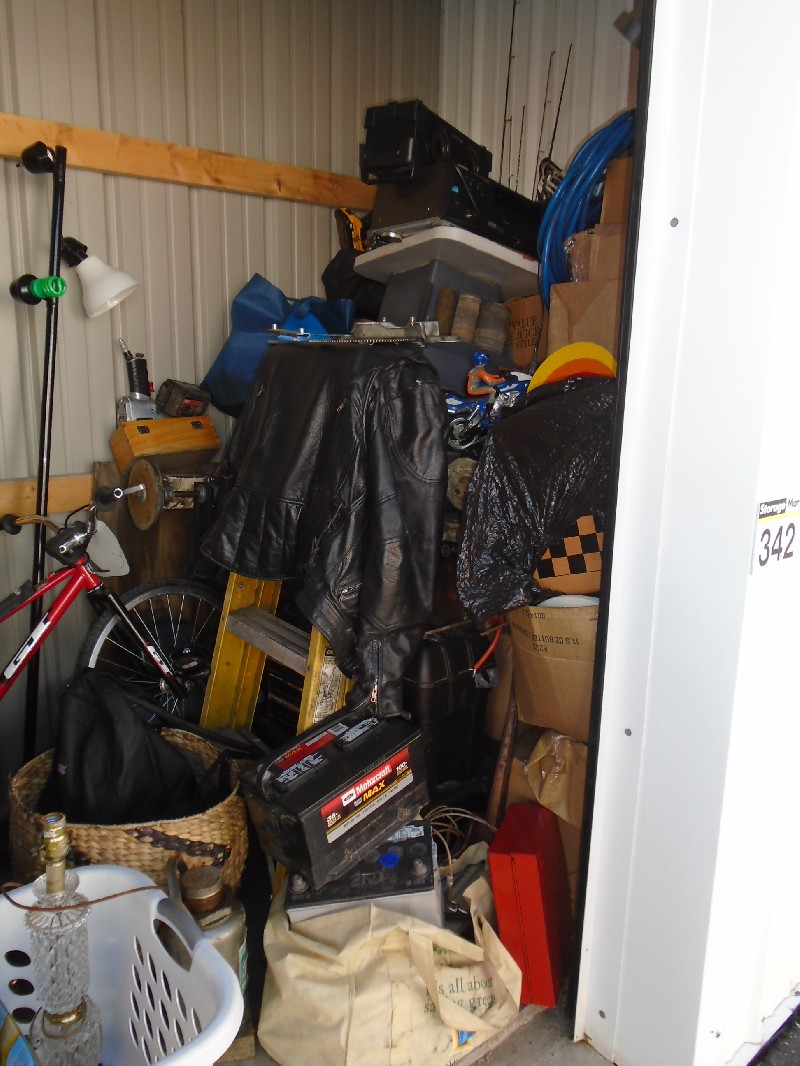 Unit appears to contain: bike, leather jacket, power saw, fans, table saw, power tools, ladder, boxes, bags, car battery, tool box
