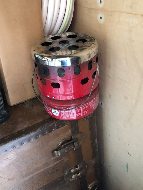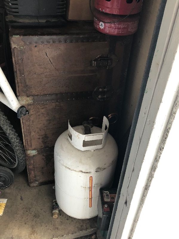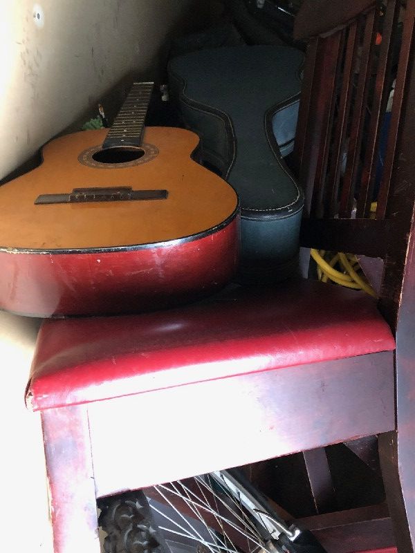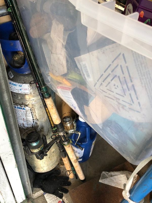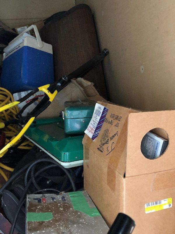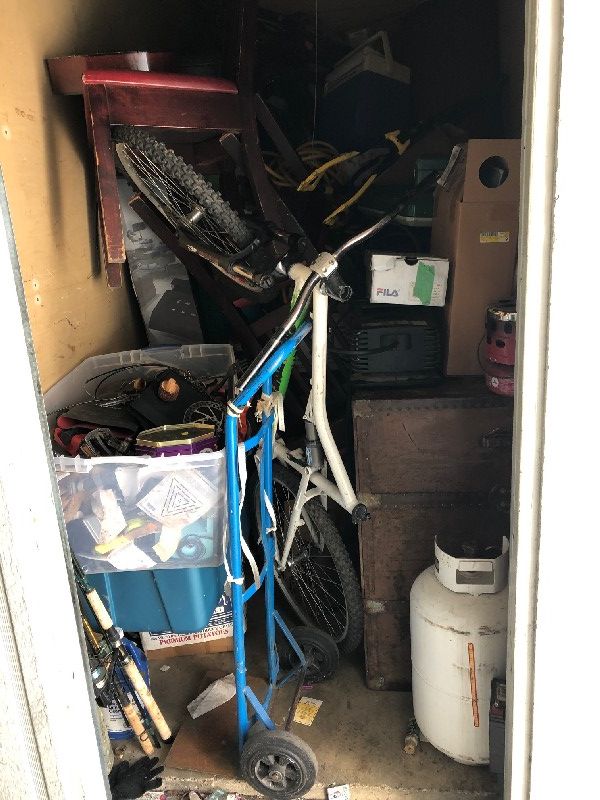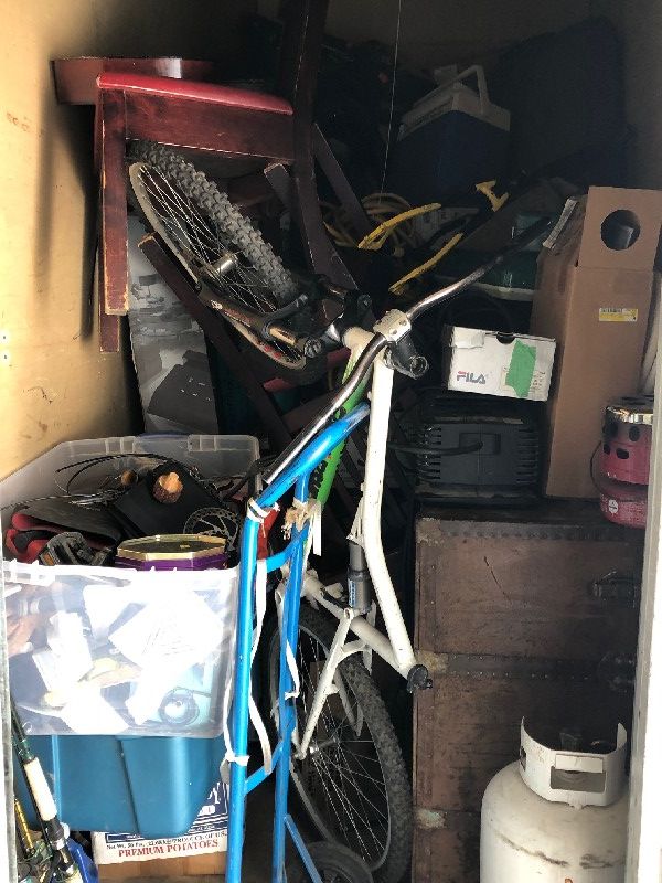 Drive up unit - LOT and LOTS of boxes, brand new garden hose, lots of bike parts, large chest, dolly, tools, camping equipment, 2 guitars, propane tank, fishing reels, and fishing reel case, dining room chairs...lots and lots of boxes