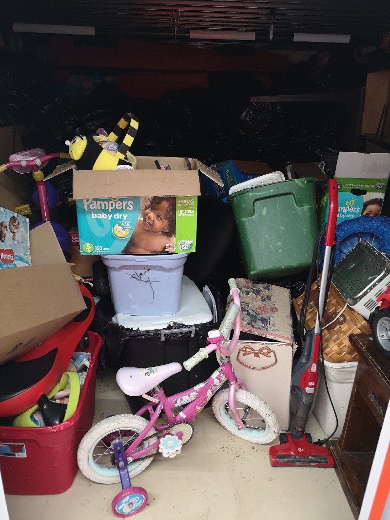 misc kids toys, kids bike, dresser, vacuums, night stand, table, kids DVDs, misc bags, misc boxes & totes, wicker basket, kids plasma car