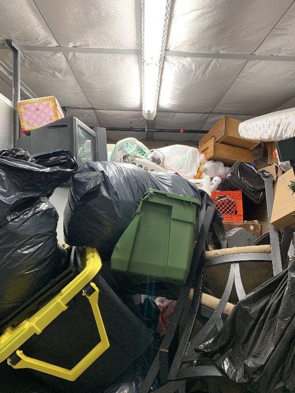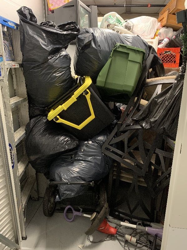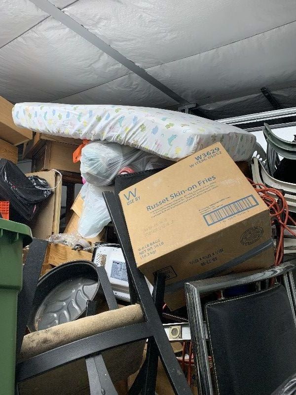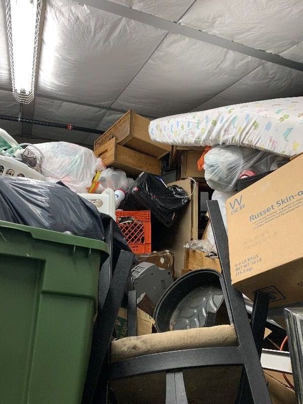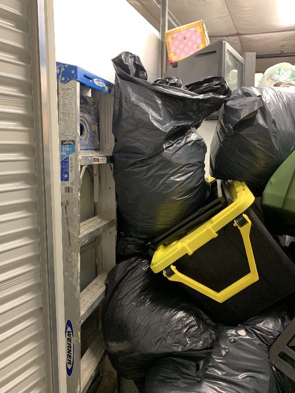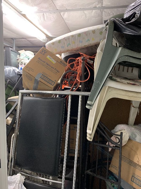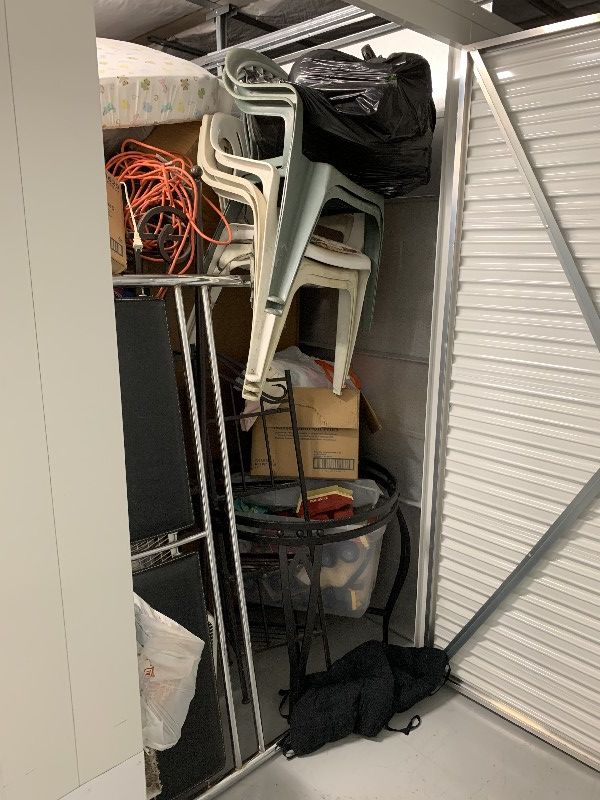 Climate control unit may contain ladder, lawn mower, weed wacker, bins, bags, TVs, chairs, furniture, patio chairs, crib mattress, refrigerator, microwave, and misc baby items