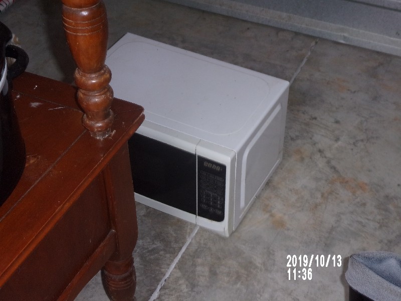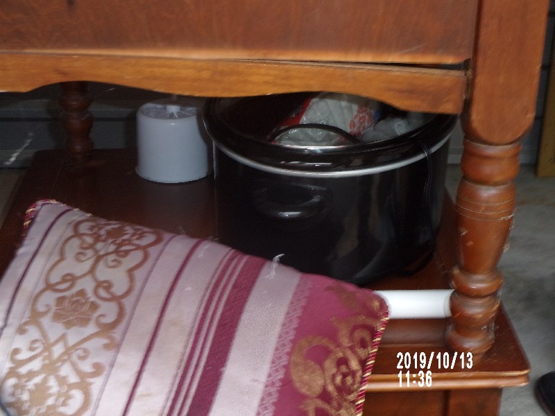 END TABLES, CLOTHES, WALL ART, BEDDING, MICROWAVE, TOTE BAGS, MAT, KITCHEN ITEMS, DISHES, POTS AND PANS, CROCK POT, RAIN BOOTS, THROW PILLOWS, FLAT SCREEN TV,