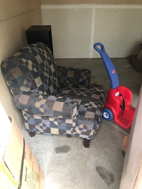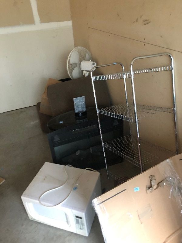 Drive up unit - easy access - Fireplace, Couch, upholstered chair, boxes, table, 2 large pictures, microwave, KIDS cart/car, wire rack, 2 shelves. a few boxes. fan.