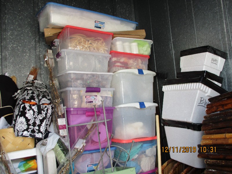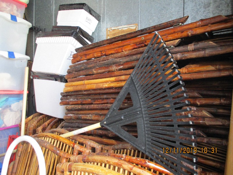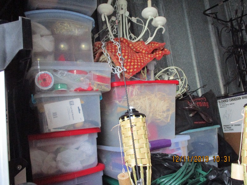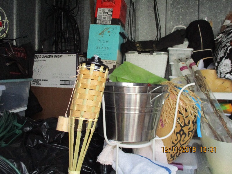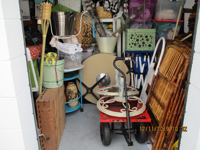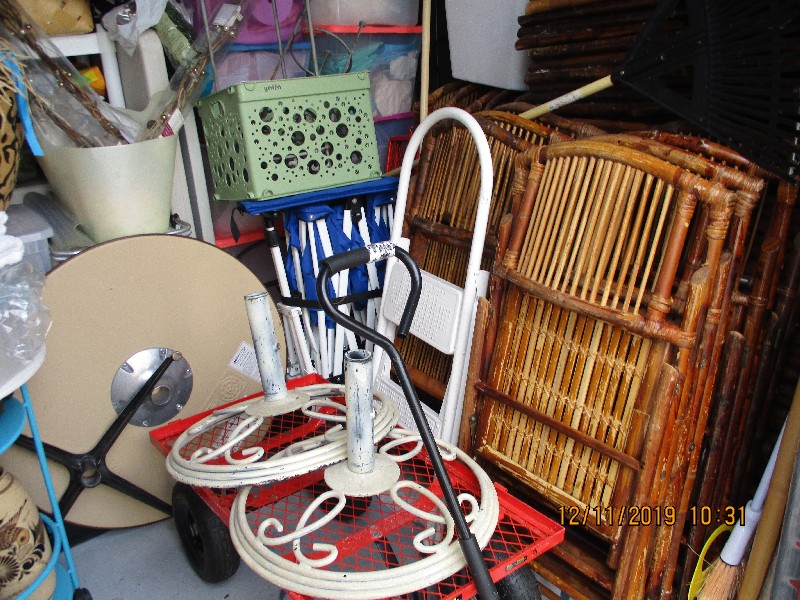 Tiki torches, wagons, rattan folding chairs, misc bins, golf clubs, hanging lights, end tables, misc boxes, folding table, folding cart, fishing pole, step ladder, rugs, plastic shelf,