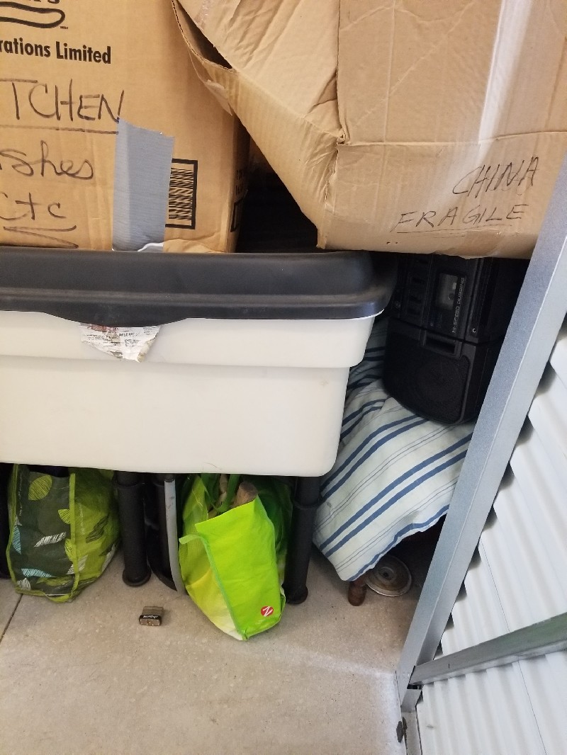 Boxes, Bins, Table Legs, Shelves, Old Tape Recorder, Bags, Microwave etc