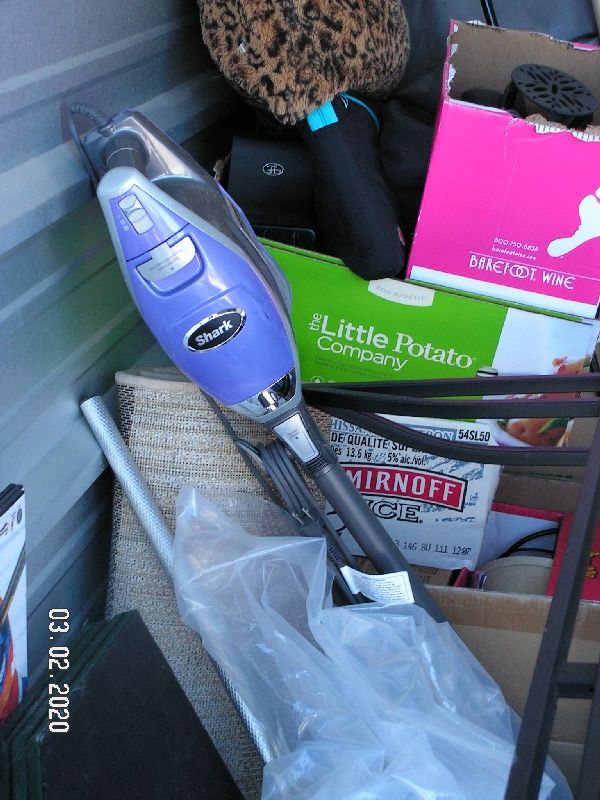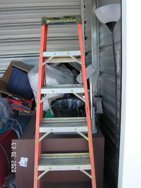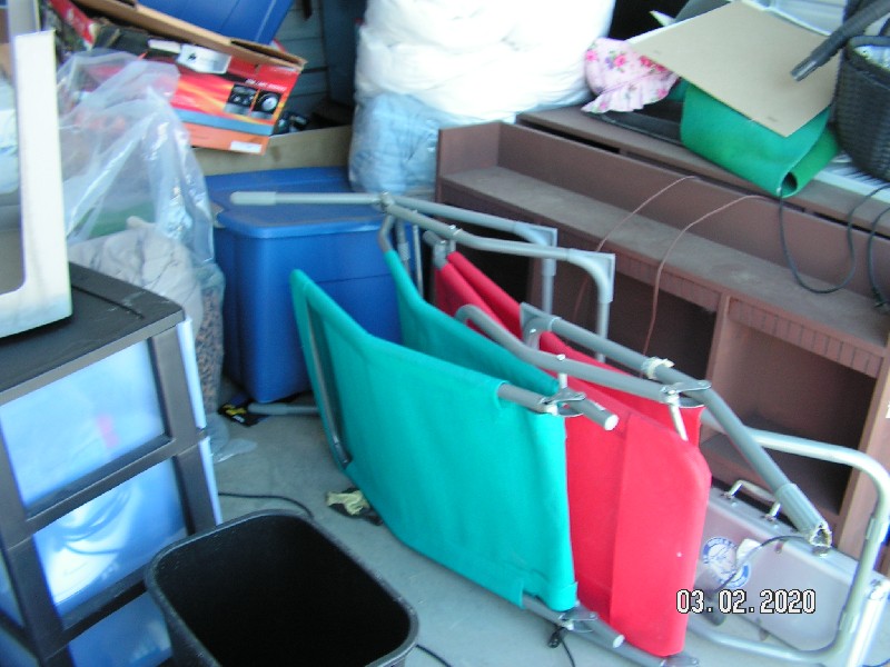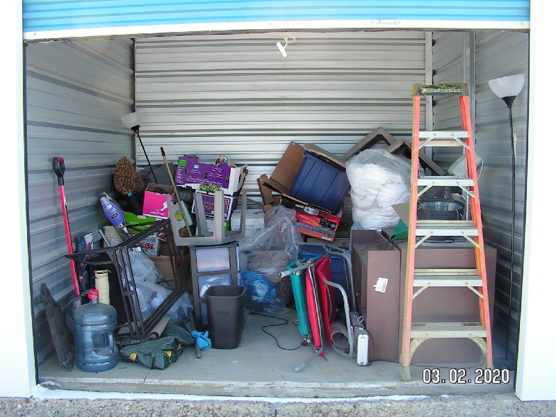 The Unit Appears to Contain: a Ladder, Tubs, Coffee Table, Lawn Chairs, Iron, Golf Clubs, Desk, Lamps, Clothes, Vacuum, Brass wall Plaque