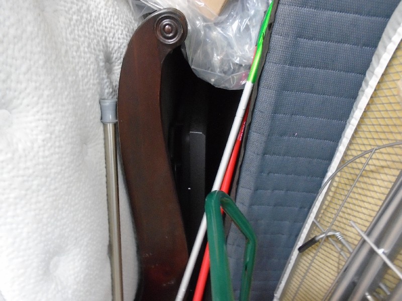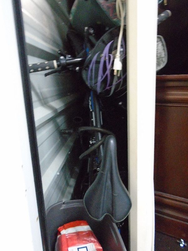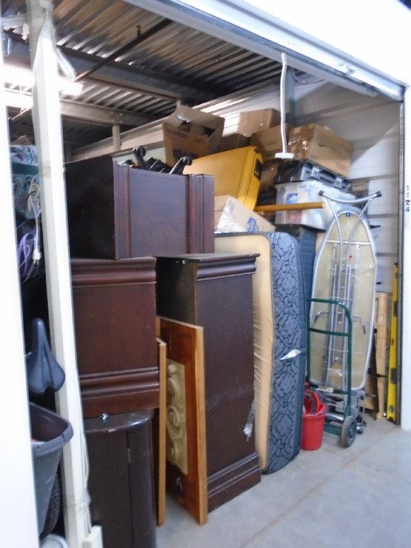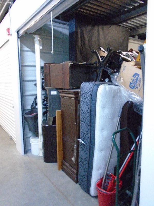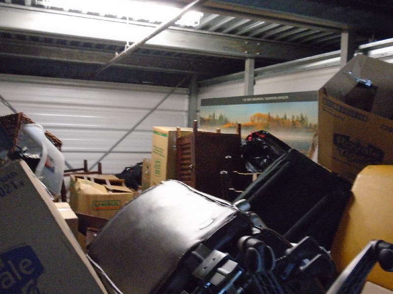 The Unit Appears to Contain: Fresser, Night Stands, Bikes, Flat Screen TV, Luggage, Office Chair, Beds, Bed Frames, Ironing Board, Construction Level, Utility Dolly, Large Framed Picture, Rug, Boxes, Ladder Bags, Totes, Furniture