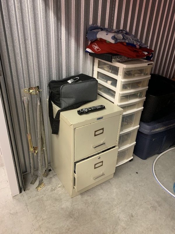 Fridge, Boxes, Bins, Filing cabinet, Satellite dish, Christmas lights, Household goods, Suit case.