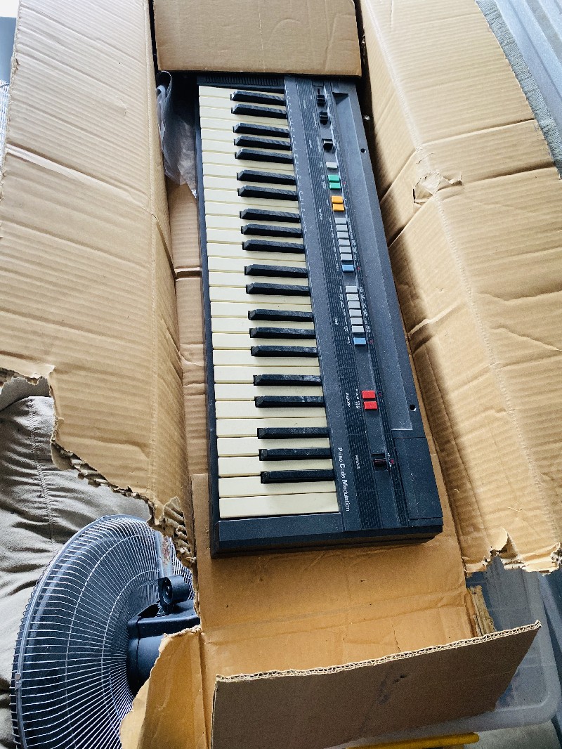 Keyboard piano, Television, Couch x2, Plastic folding table, Hard wood Dining table, Wicker chair, Misc boxes, Misc plastic totes
