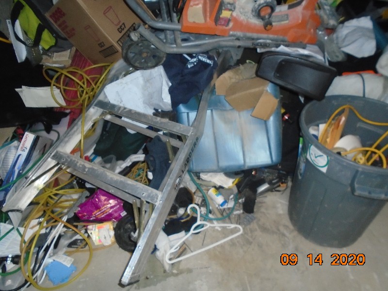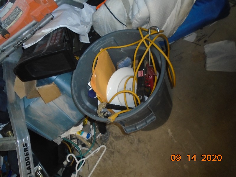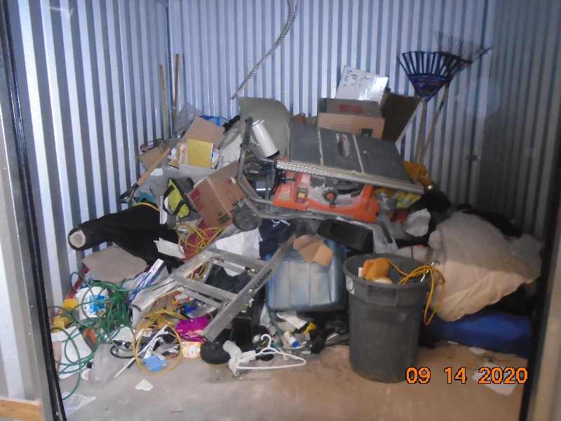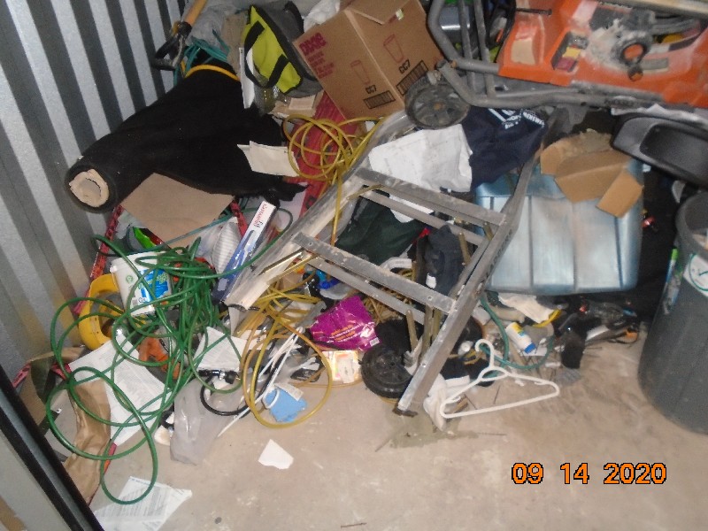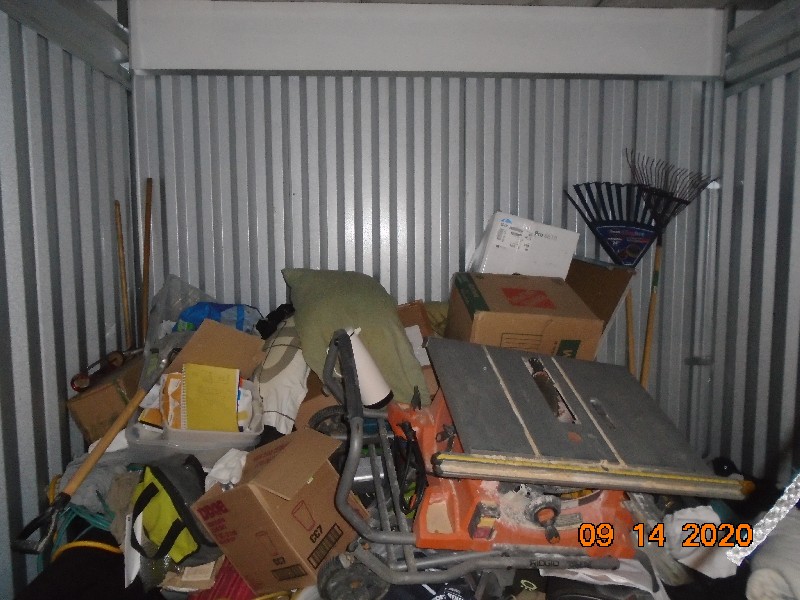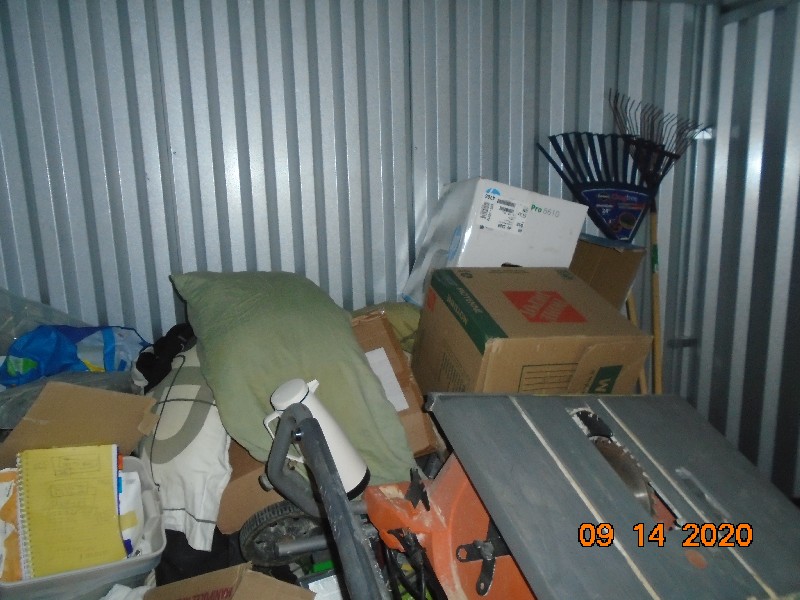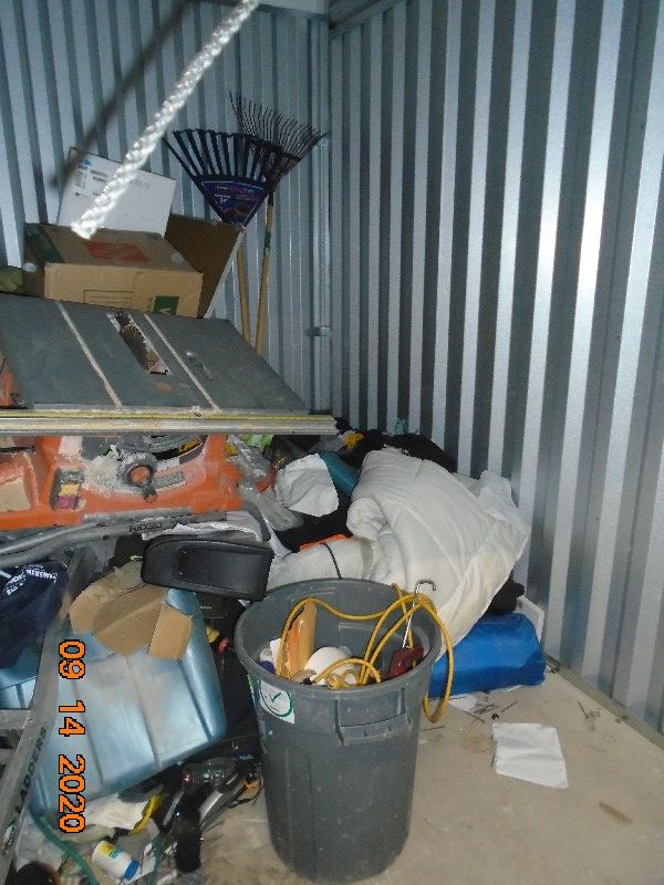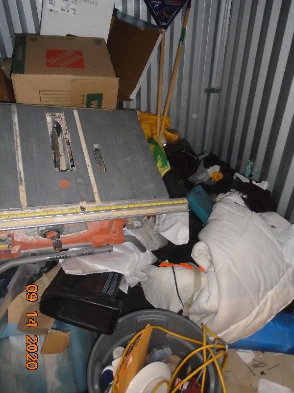 The Unit Appears to Contain: Extention Cords, Nail Gun, Level, Pry Bar, Suitcases, Landscape Fabric, Caulking Guns, Table Saw, Nails & Screws, Skill Saw, Hard Hat, Step Ladder, MasterCraft Socket and Bit Set, Heater, Pillows, Boxes, Totes, Rakes, Tool Boxes, Blankets, Thermos, Boots, Scale, Clothing, Tarp, Shovel