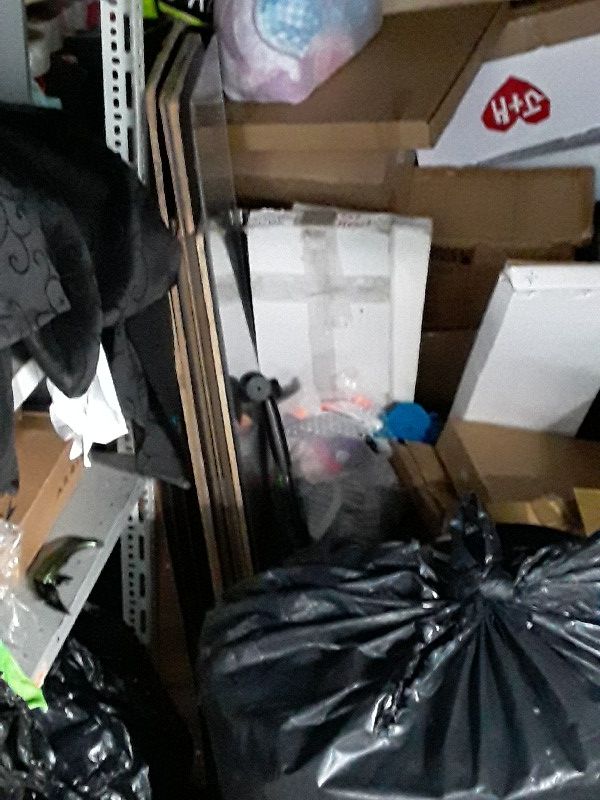 Unit contains kid's scooter, metal shelving, office chair, bicycle, boxes, costume props, ect. . .