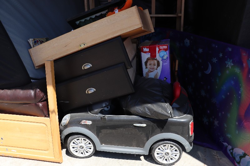 love seat, 3 seater couch, kids bed, kids mattress, queen mattress, queen box spring, mini cooper childs car, storage bench, fire place, drawers, cabinet, boxes, end table, paintings, garbage bags, kids books,