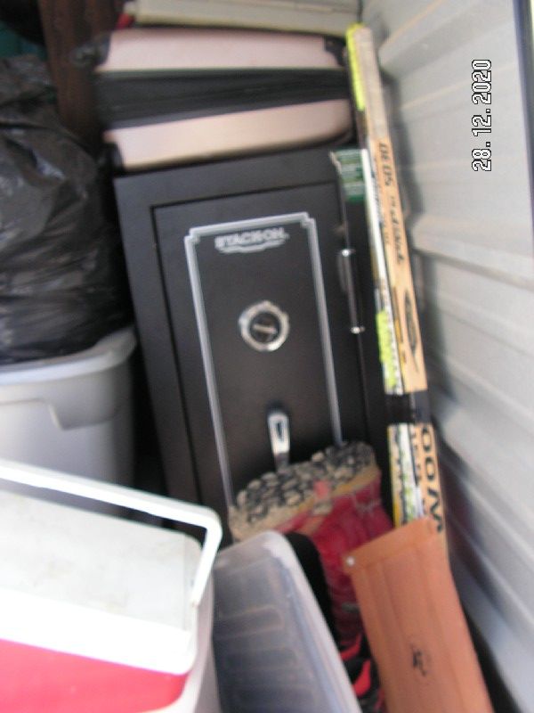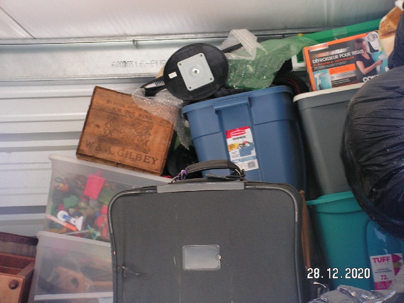 The Unit Appears to Contain: Safe, Toaster Oven, Microwave, Kitchen Table and Chairs, Hockey Helmets, Hockey Sticks, Bike, Computer Chair, Suitcase, Golf Bag with Clubs, Igloo Cooler, Box Spring, Computer Monitor, Pictures, Dresser, VHS Tapes, Roller Blades, Antique Toys, Lunch Box, Storage Boxes, Summer Chairs, Rigger Boots, Sofa Chair, Antique Lamp, Space heater