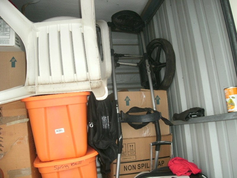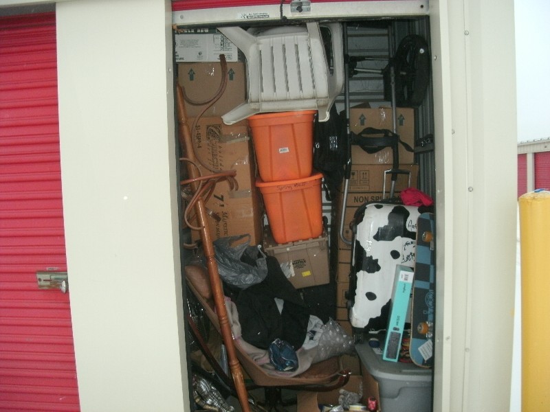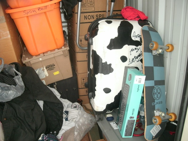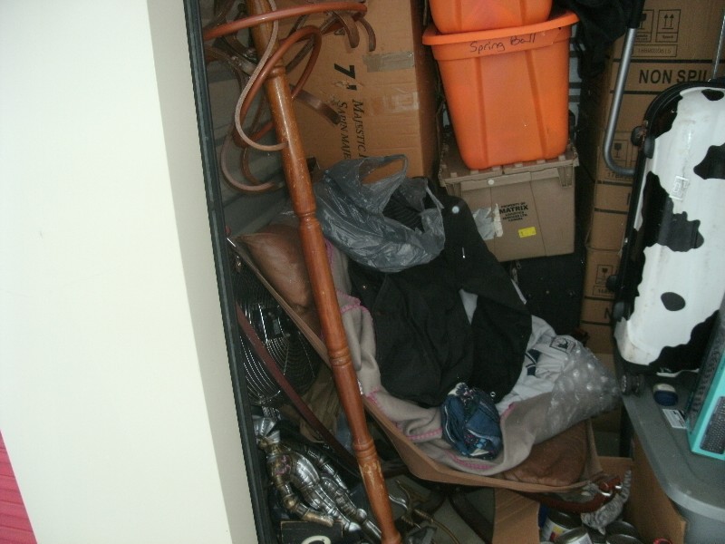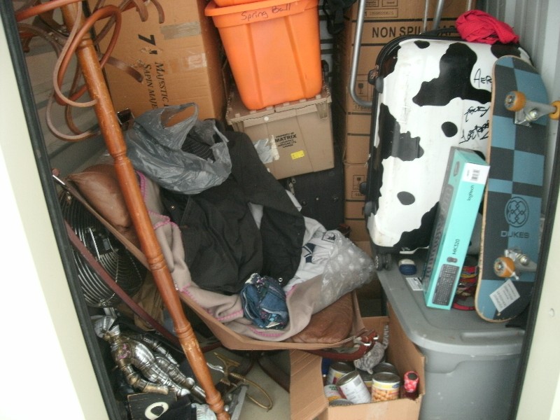 Unit appears to contain, skateboard, luggage, totes, coat rack, fan, lawn chair, boxes, golf caddy, chair, and a coat among other misc items.