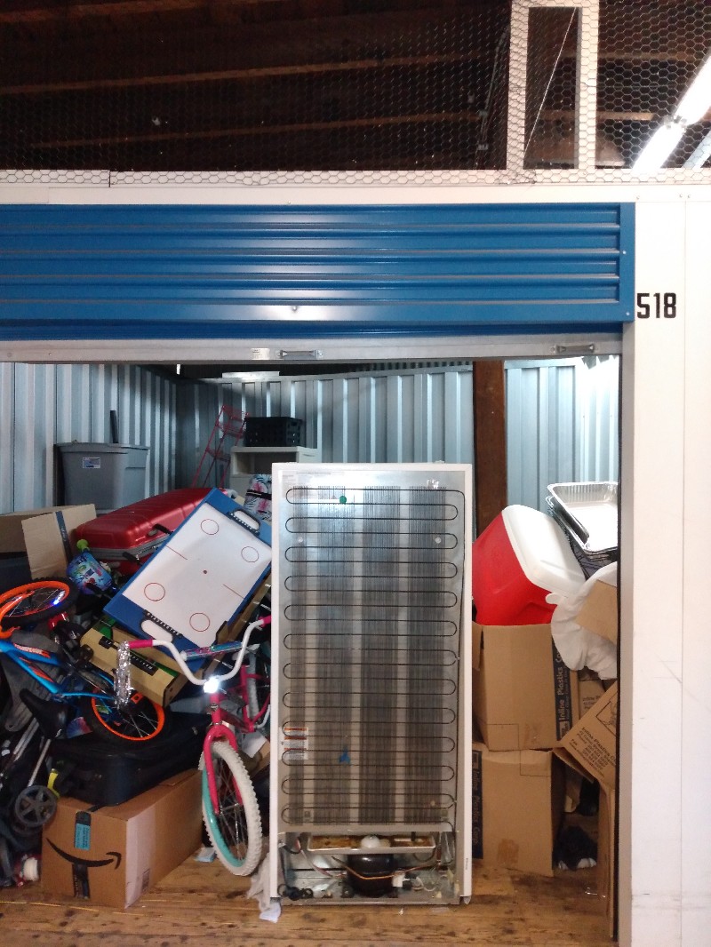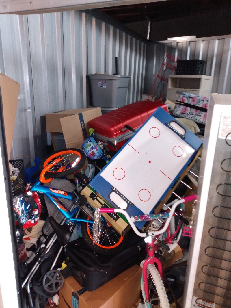 kids bikes, fridge, misc. household, shelves, cooler, luggage, boxes, and bags.