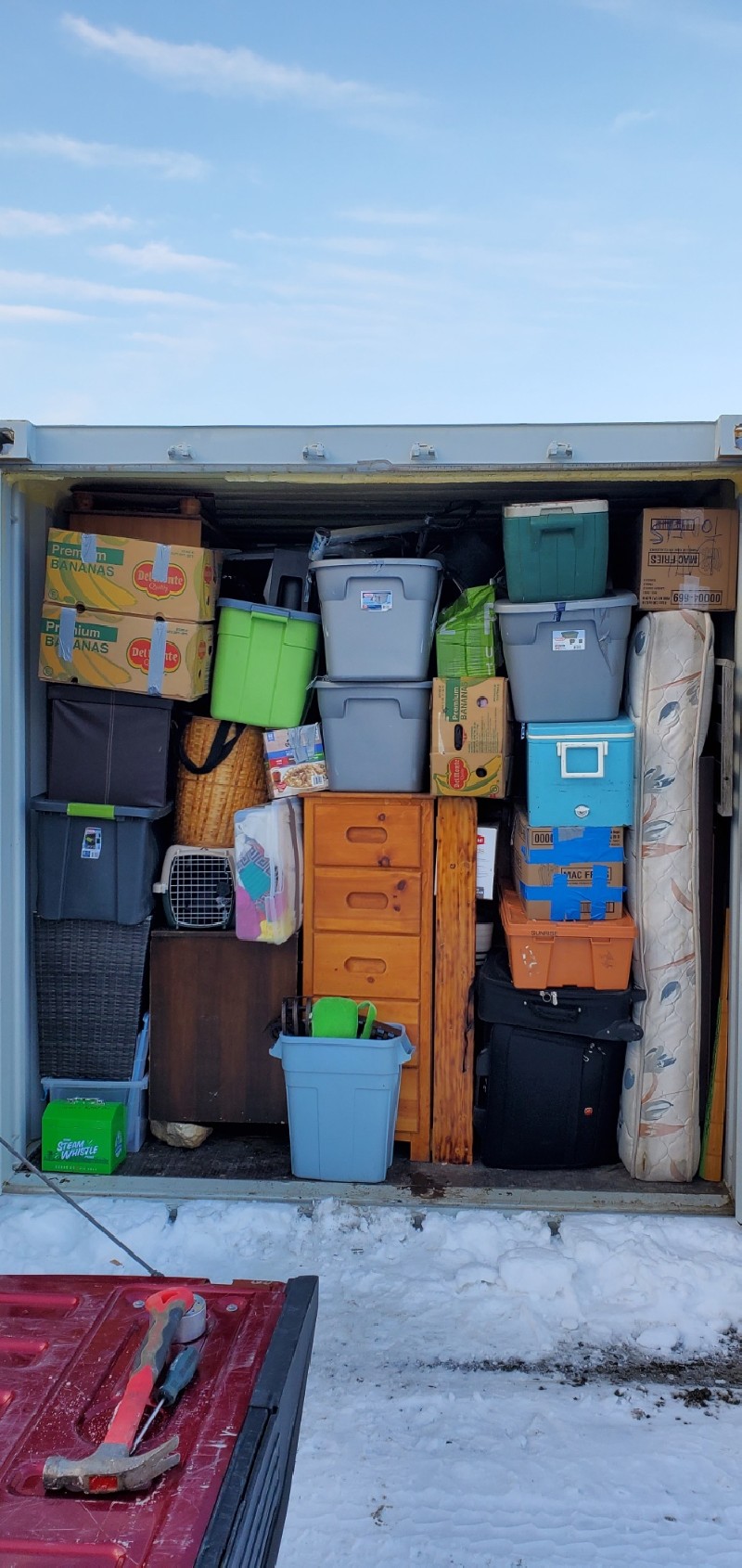 All items are up for auction inside this BSB unit. Which is loaded with what we believe to be furniture, totes, a mattress, and other miscellaneous items