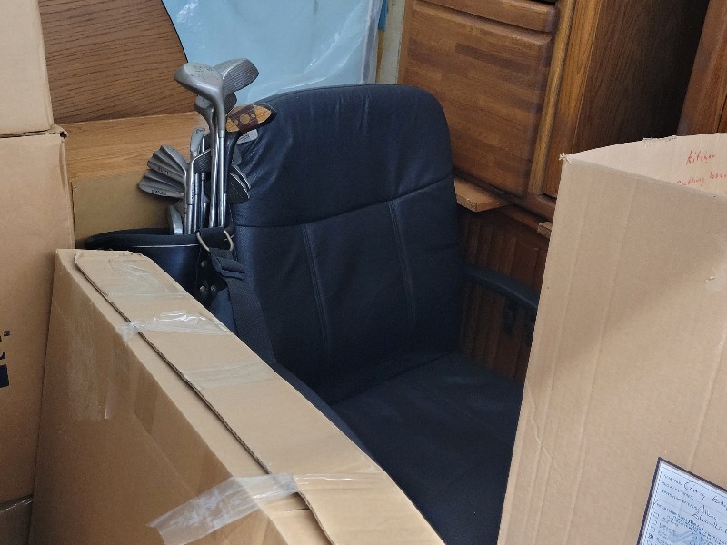 Wooden cabinets, king size bed with box spring, golf clubs, computer, keyboard, tool box, black chair, wicker basket, clothes, entertainment center, speakers, table.