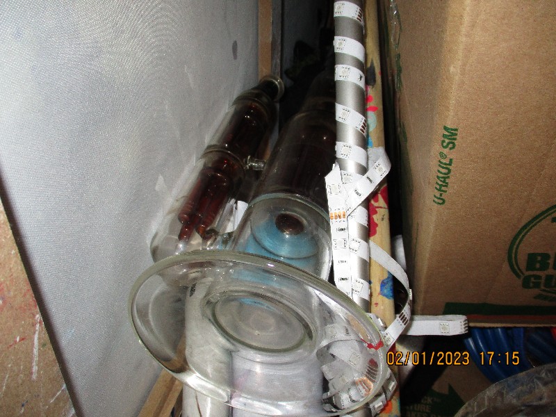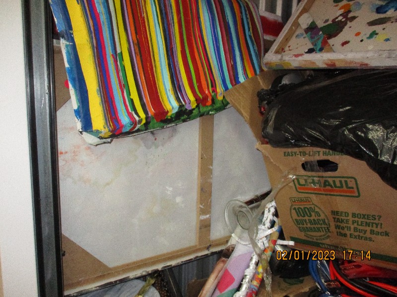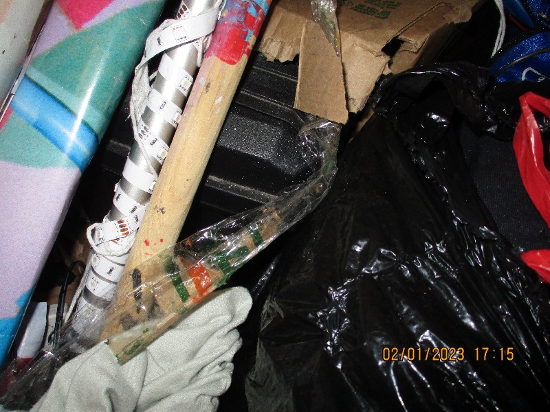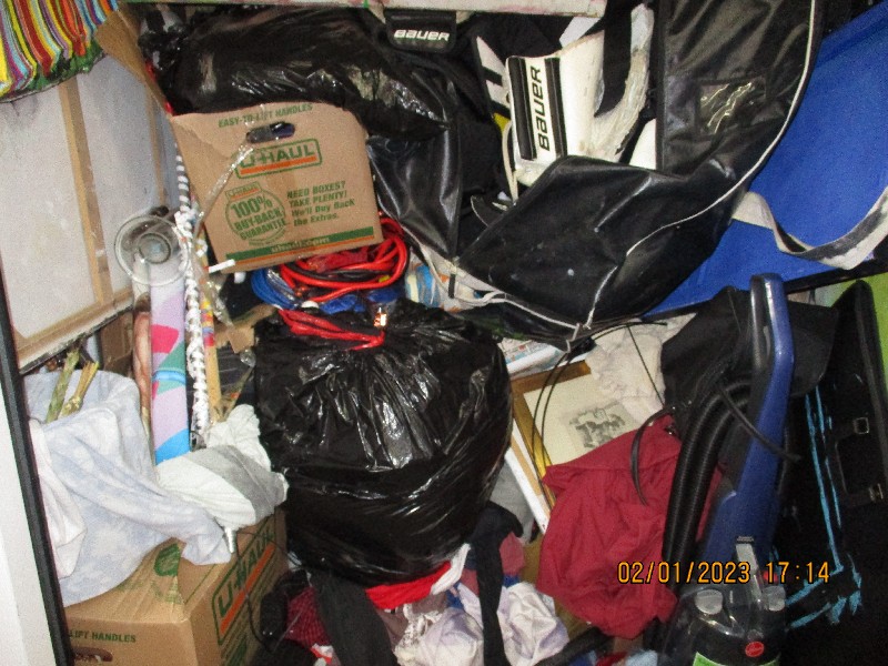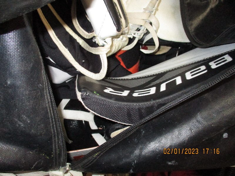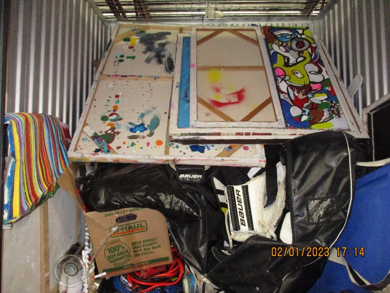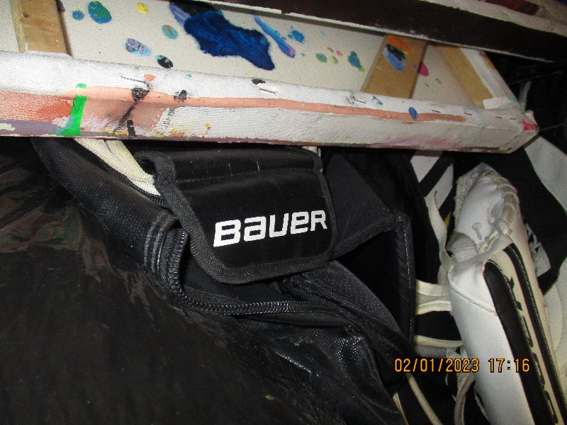 Art work, Vacuum, Boxes, tool box, hockey equipment, shoes.