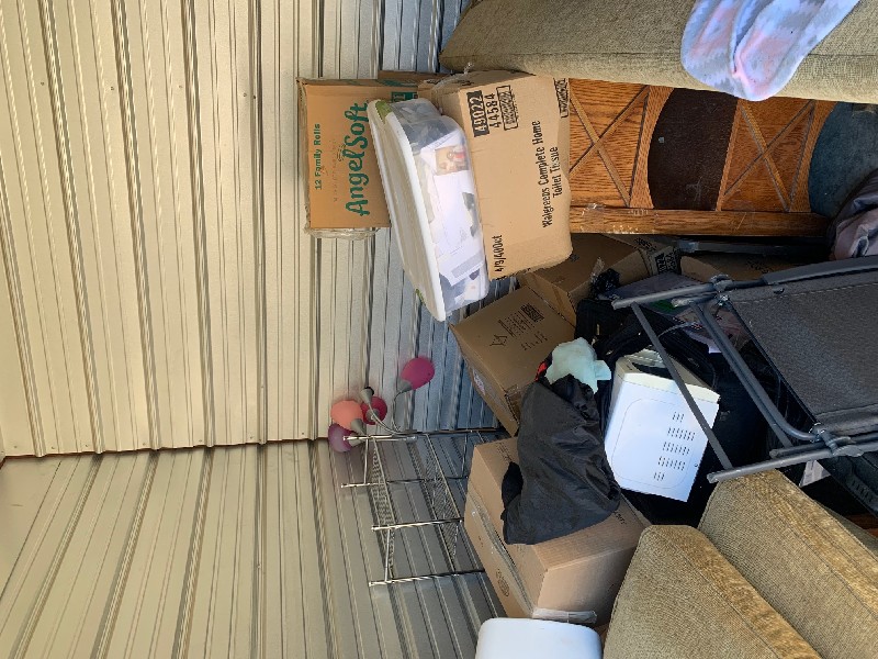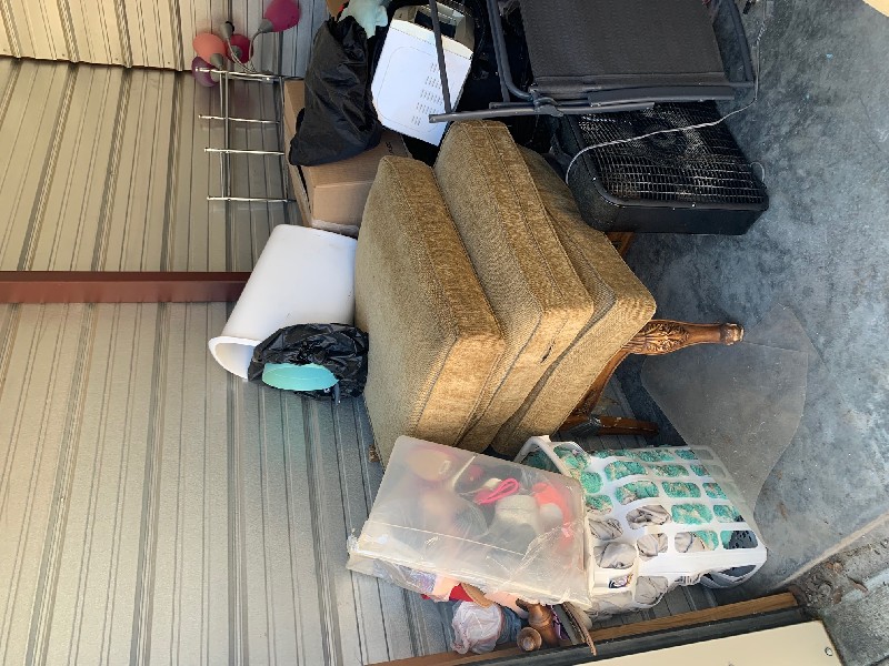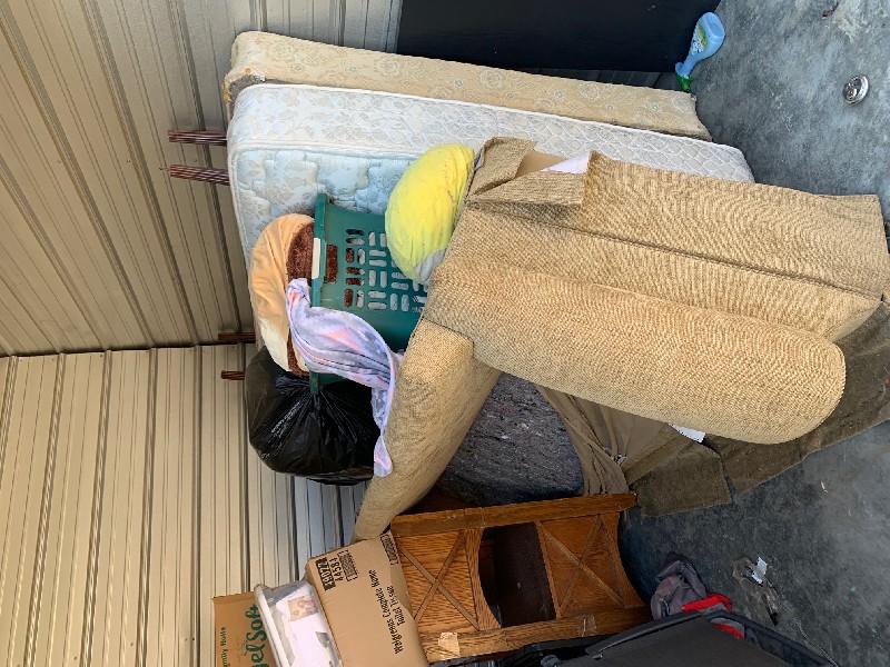 Plastic Containers (contents unknown), Boxes (contents unknown), Microwave, Mattress & Box Spring, Bed Frame, Lamp, Sofa, End Table, Box fan, Stand, Towel Rack, Shoes, Stuffed Animals, Blankets
