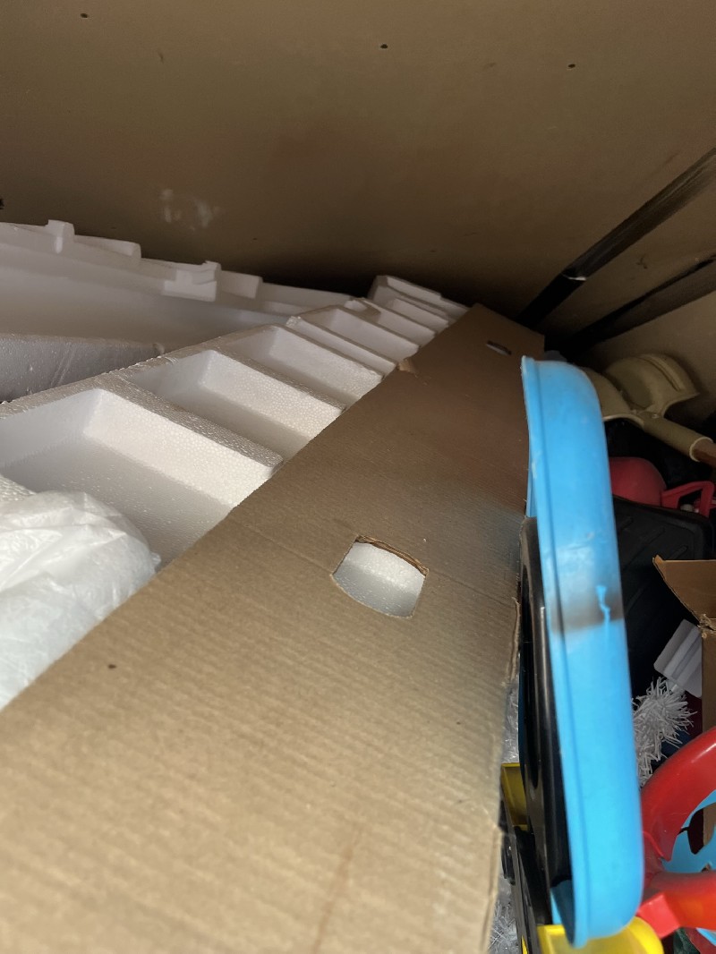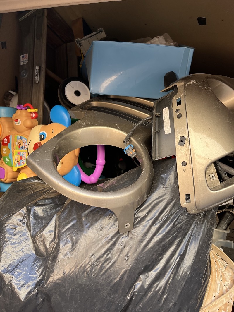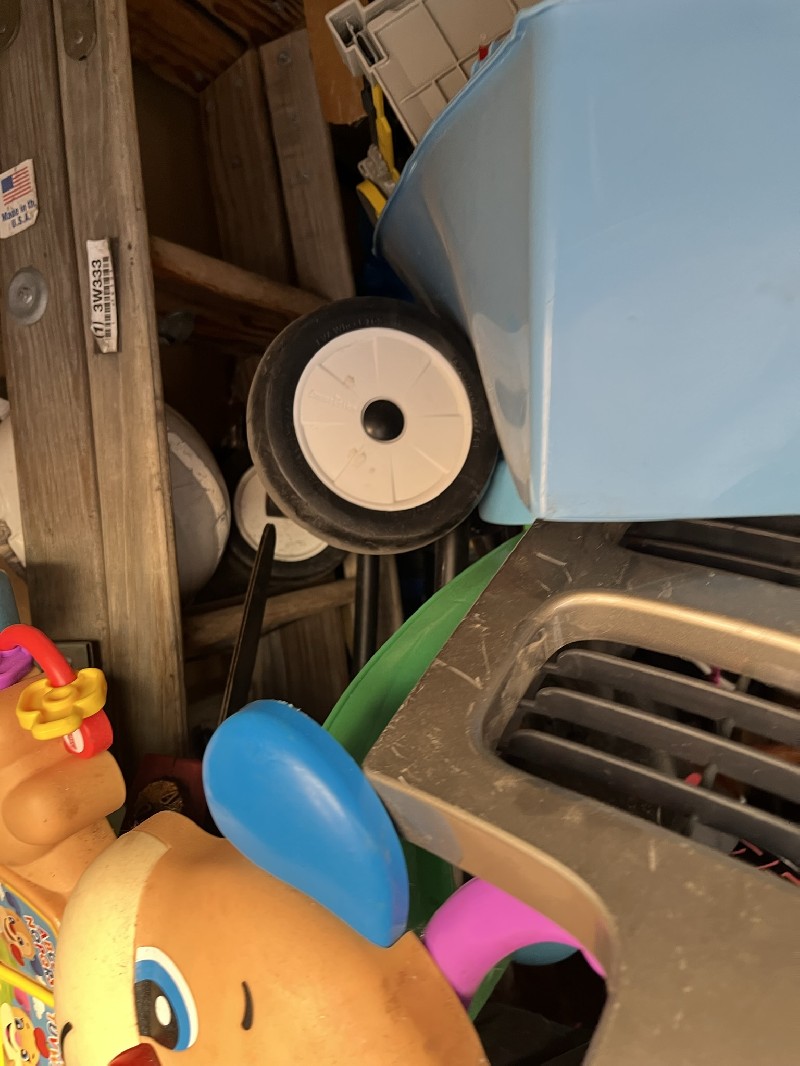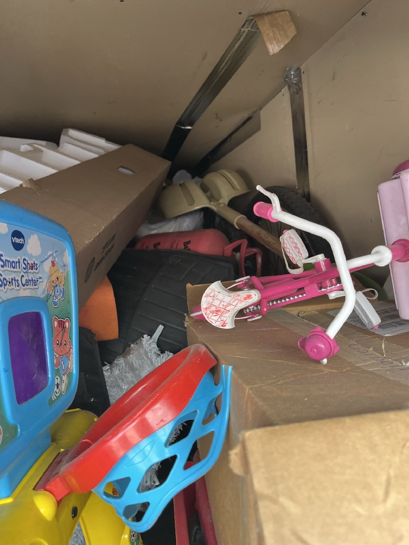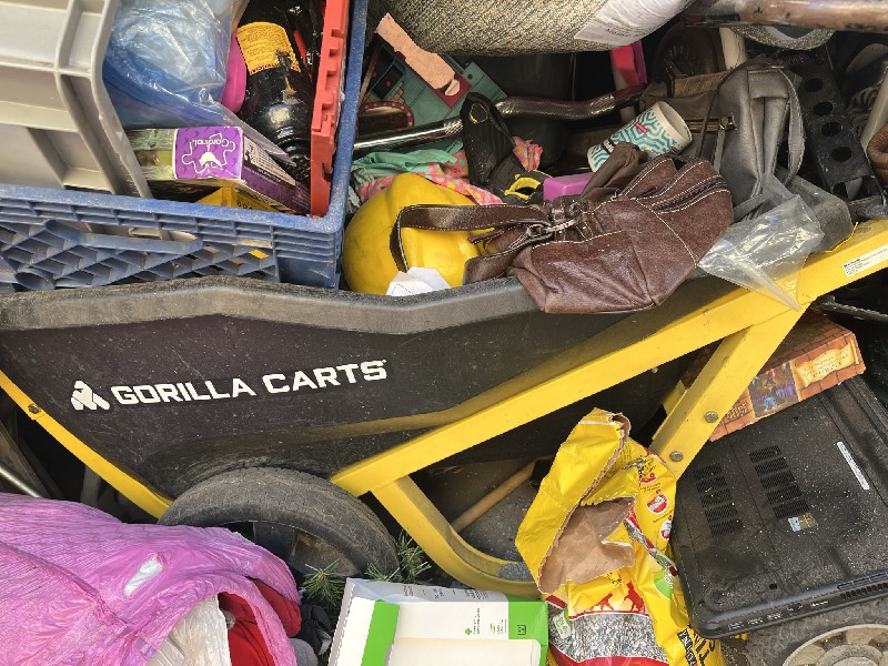 Lawn Mower, Car Bumper, Toys, Bikes, Gorilla Cart, Dolly, Laptop, Clothing, 6+ Totes (Unknown Contents), Cooler, Printer, Car Seat, Pack’N’Play, Bed Frame, Christmas Tree, Stuffed Animals, 2 Ladders, 2+ Boxes (Unknown Contents), Solar Panels, Weights, Purse (Unknown Contents)