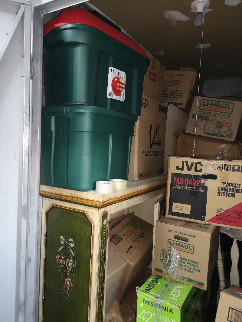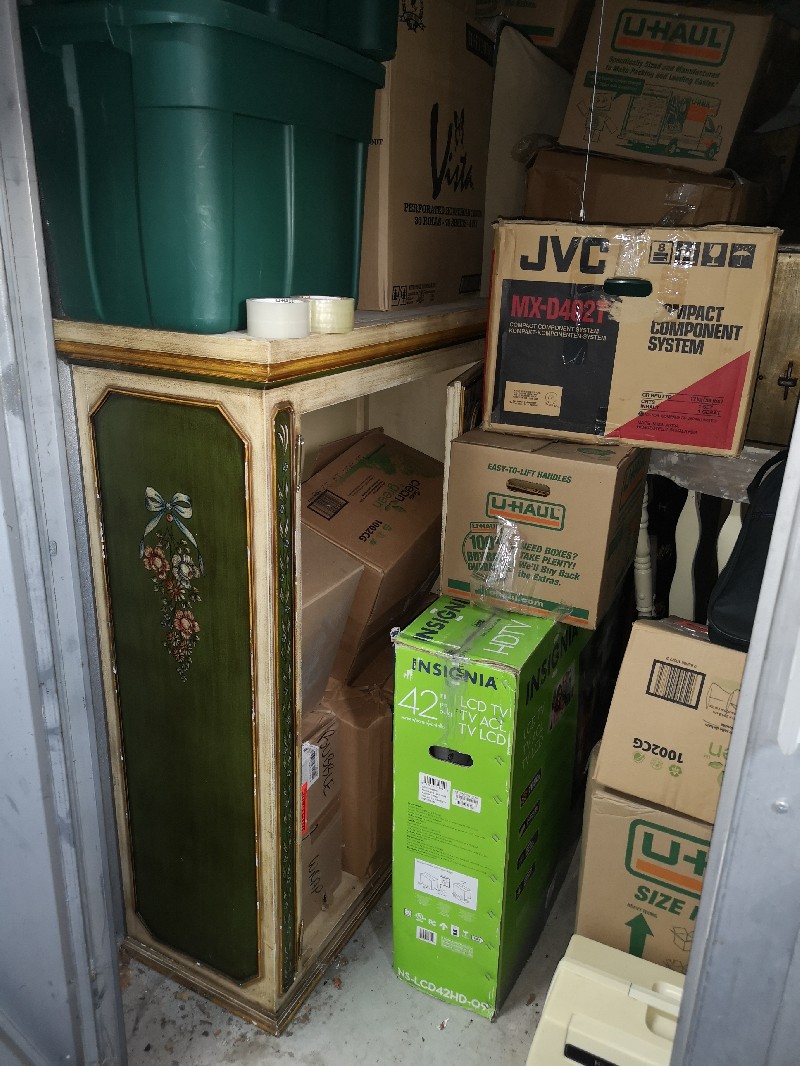 hutch, tv, misc boxes, misc totes, rocking chair, sewing machine