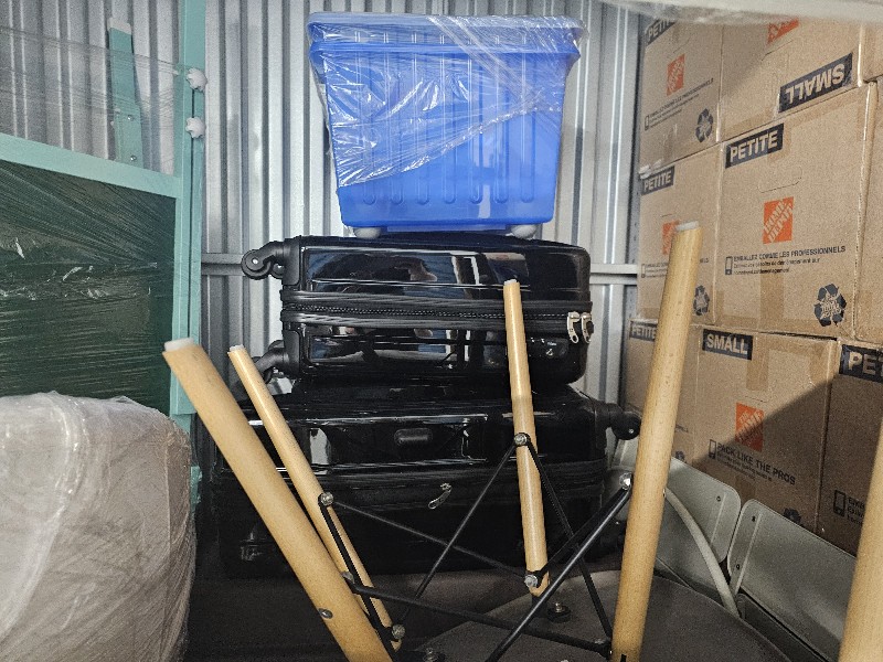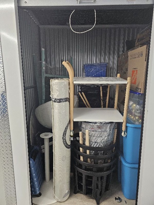 Unit contains a bar cart, luggage, a swivel chair, Christmas decorations, a kid's easel, boxes, bins, ect. . .