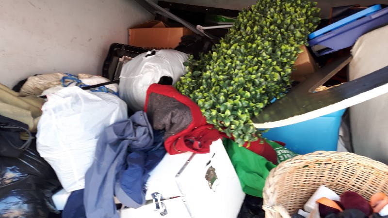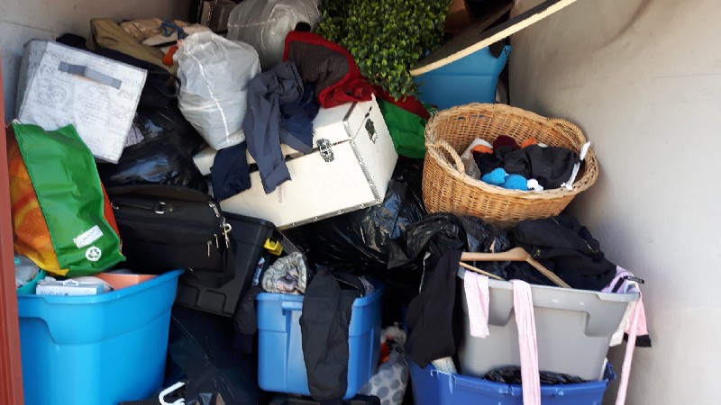 clothes, rubber bins, suit cases, back packs, bed, house hold goods
