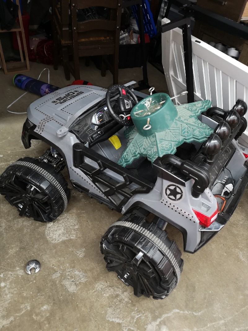 battery operated kids car, mixing turntable, dining chairs, bedframe, lamp, night stand, misc totes, cooler, desk, baby sled, end table, portable heater, aquarium, window, misc hand tools