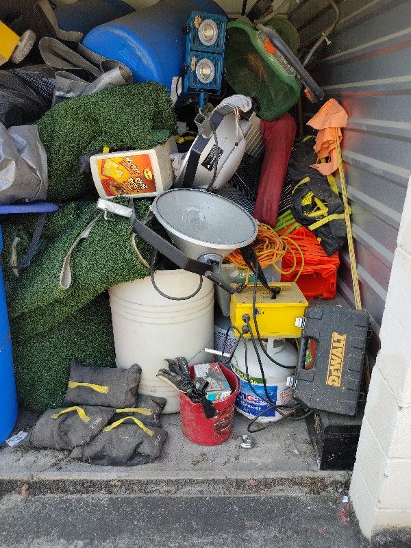 tool boxes, seed feeder, fan, buckets, caution cones, light stands, misc items